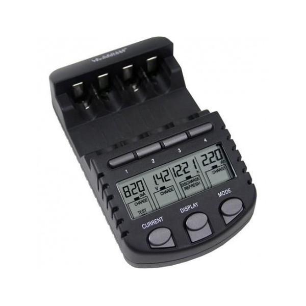 Na wyświetlaczu LCD wskazywane są parametry oddzielnie dla każdej komory ładowania. Za pomocą 7 przycisków, w które wyposażona jest ładowarka, możemy zobaczyć prąd ładowania, prąd rozładowania, napięcie, pojemność, czas ładowania, tryb pracy oddzielnie dla każdego obwodu. Po zakończeniu procesu ładowania urządzenie przechodzi w tryb odświeżania akumulatorów. Napięcie ładowania zostaje zmniejszone w celu jedynie podtrzymania stopnia naładowania.