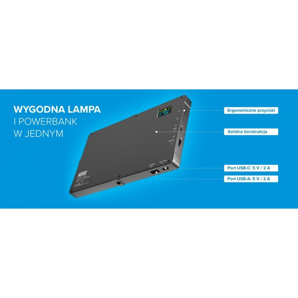 Lampę LED Newell RGB-W Rangha Max wyposażono w przeszło 2 razy bardziej pojemny akumulator, w porównaniu do starszej siostry. 10000 mAh pozwoli korzystać z przenośnego źródła światła do 3 godzin na jednym ładowaniu! Na obudowie urządzenia, oprócz portu USB-C pozwalającego uzupełniać moc lampy, umieszczono także gniazdo USB. Dzięki niemu zamienisz lampę w powerbank i z łatwością naładujesz swój smartfon, słuchawki lub inne akcesoria towarzyszące Ci na planie zdjęciowym lub fotograficznym.