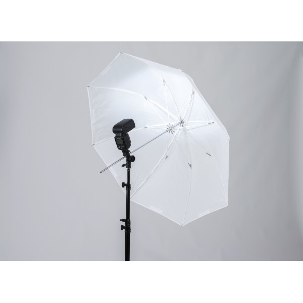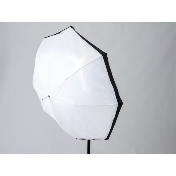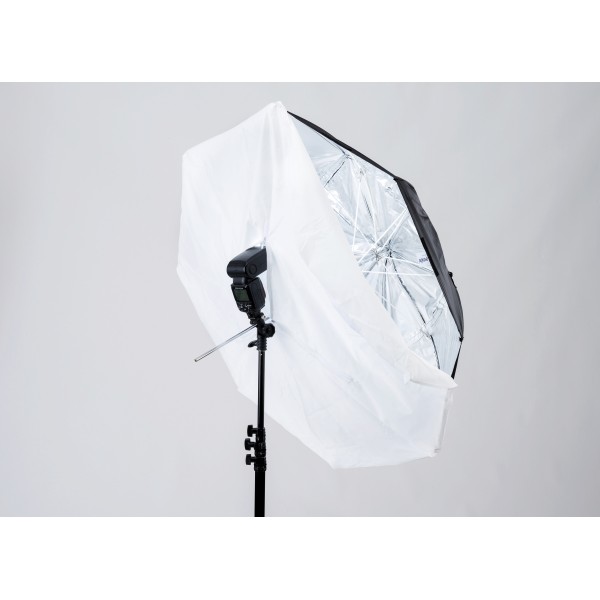 Umbrela box to połączenie parasolki i softboxa. Do czaszy wykonanej z czarno-białej folii PCV doszyty jest dyfuzor z białej tkaniny rozpraszającej światło, W tkaninie dyfuzyjnej znajdują się trzy nacięcia zapinane na zamek błyskawiczny, przez które można wsunąć do wnętrza głowicę lampy błyskowej.