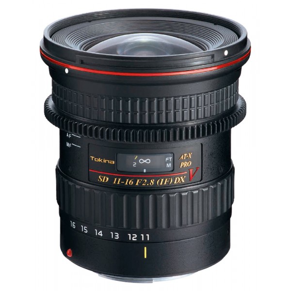 Tokina AT-X 11-16 PRO DX V stanowi pomost pomiędzy modelem klasycznym przeznaczonym dla fotografów a wersją w pełni filmową stanowiącą odrębny segment obiektywów. Tokina AT-X 11-16 PRO DX V świetnie sprawdzi się na rynku video HDSLR, gdyż jest jedynym szerokokątnym obiektywem ze światłosiłą f/2.8 zaprojektowanym do pracy z lustrzankami formatu APS-C, wyposażonym w pierścień zębaty do systemu follow-focus. Konstrukcja optyczna obiektywu jest taka sama jak w wersji fotograficznej. Bazuje między innymi na dwóch soczewkach asferycznych (jednej szklanej i jednej hybrydowej P-MO) oraz dwóch soczewkach nisko-dyspersyjnych SD.