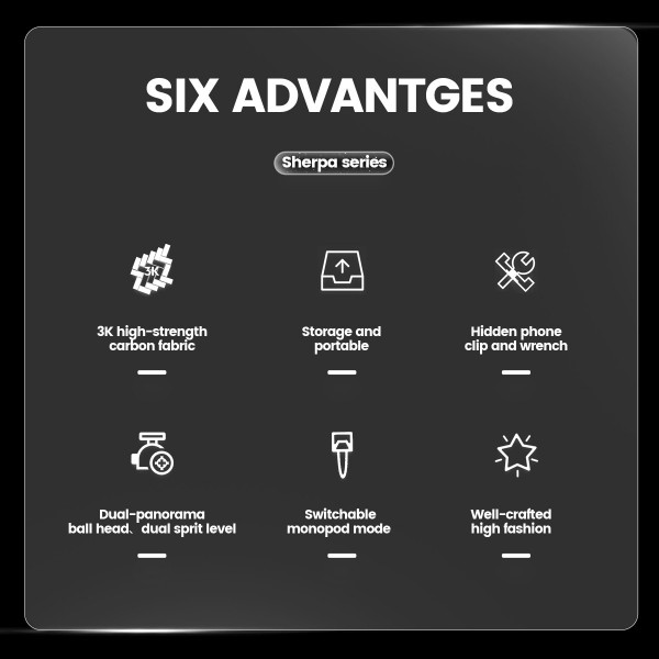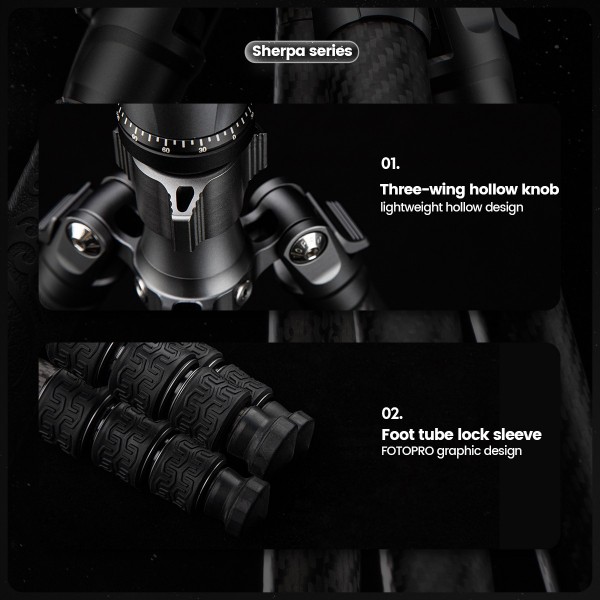 Fotopro Sherpa Max wyróżnia się nie tylko nieprzeciętną funkcjonalnością, ale także oryginalnym wyglądem i wysoką jakością wykonania. Połączenie lekkiego włókna węglowego 3K oraz metalowych elementów wykończonych szarym kolorem świetnie się prezentuje, zapewniając przy tym trwałość na długie lata. Co ważne, wszystkie statywy firmy Fotopro objęte są sześcioletnią gwarancją!