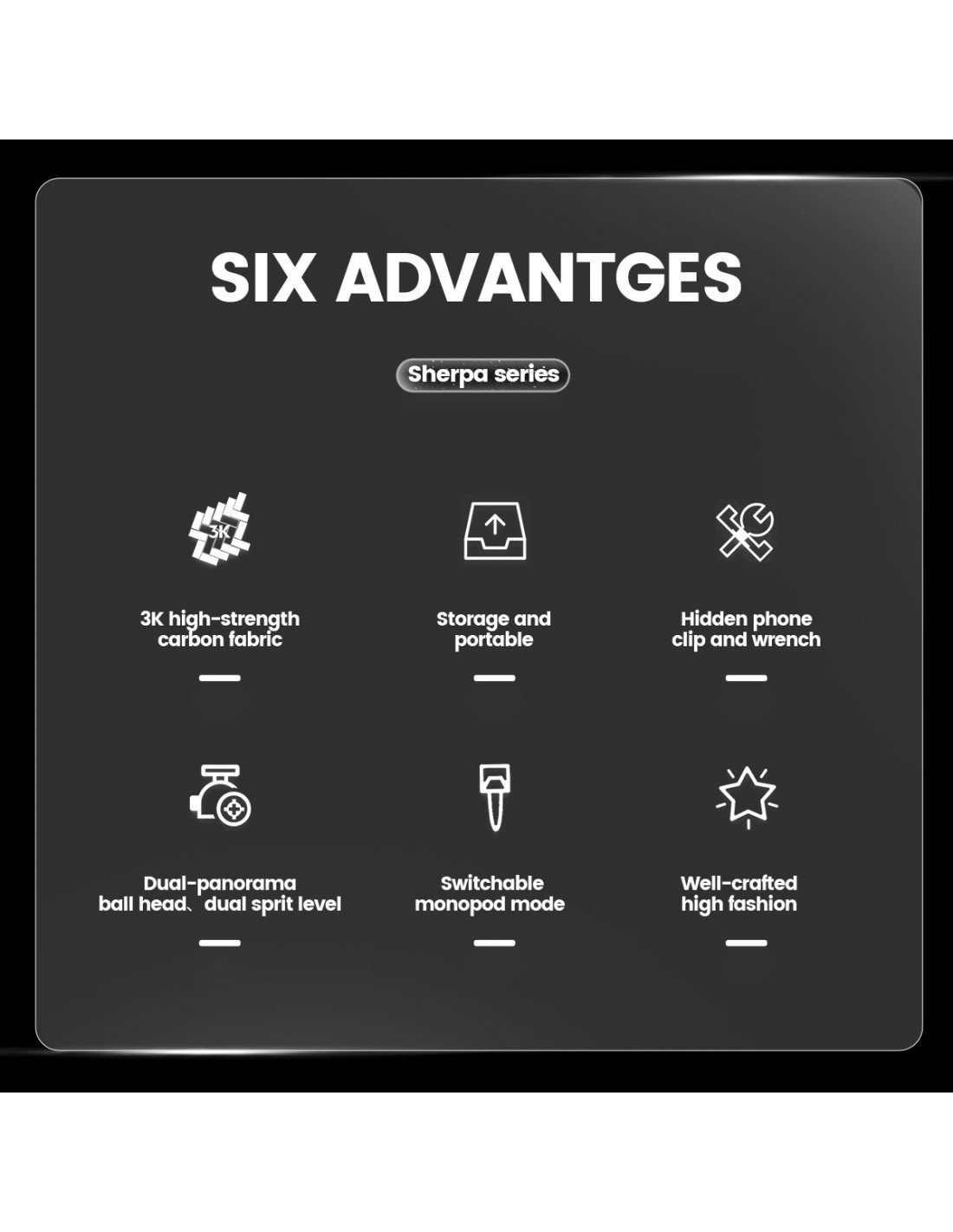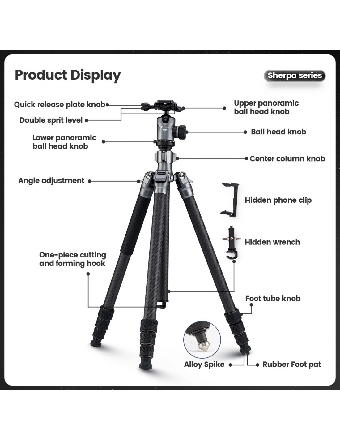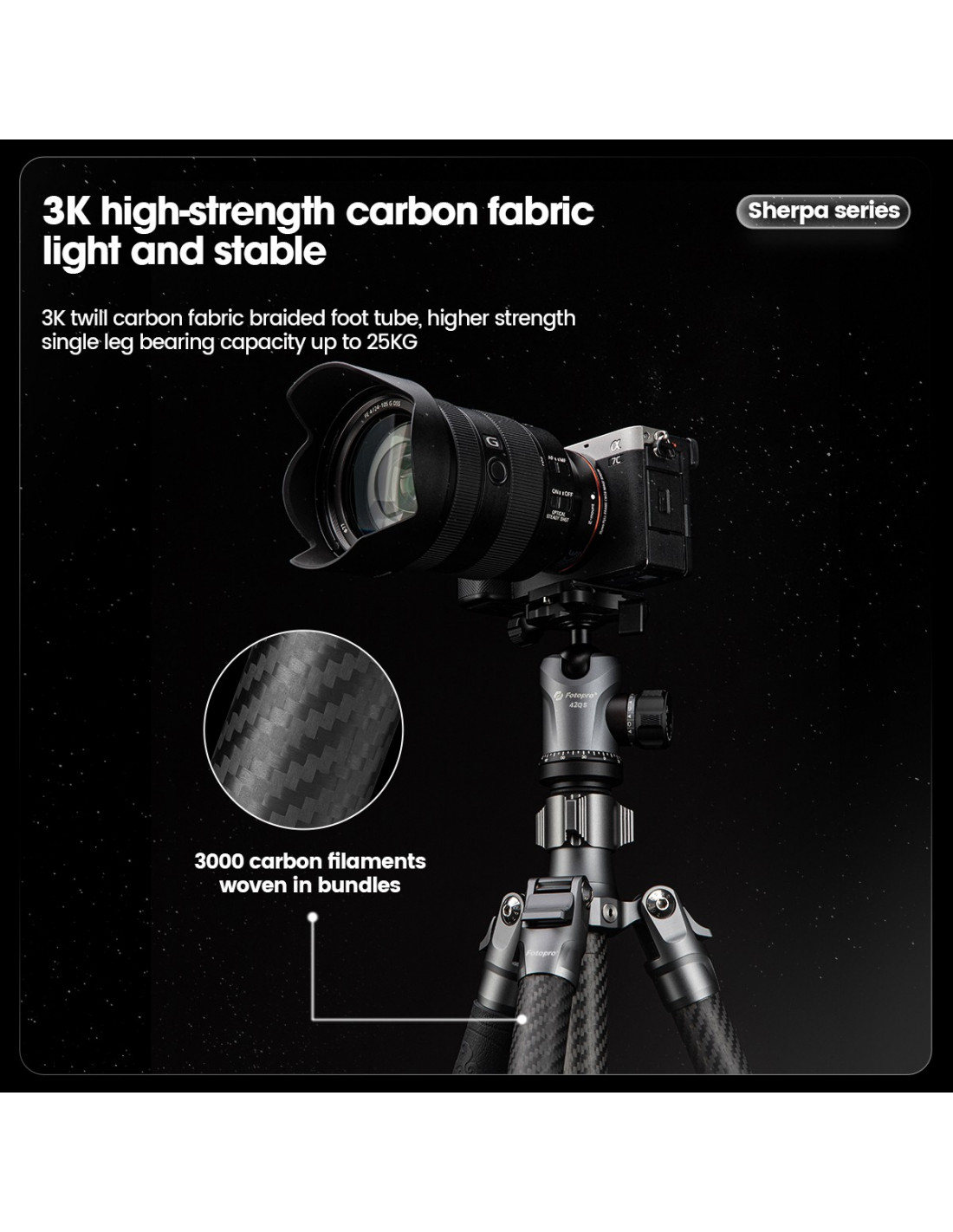 Fotopro Sherpa Max wyróżnia się nie tylko nieprzeciętną funkcjonalnością, ale także oryginalnym wyglądem i wysoką jakością wykonania. Połączenie lekkiego włókna węglowego 3K oraz metalowych elementów wykończonych czarnym kolorem świetnie się prezentuje, zapewniając przy tym trwałość na długie lata. Co ważne, wszystkie statywy firmy Fotopro objęte są sześcioletnią gwarancją!