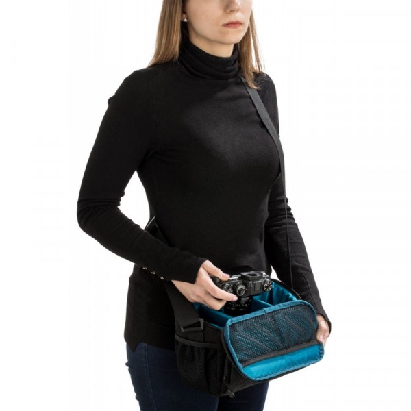 - Torba posiada dwie boczne kieszonki wykonane z siatki, dzięki czemu mamy dodatkowe miejsce na osłony obiektywów, klucze lub małe butelki wody oraz dodatkową kieszonkę z przodu torby zamykaną na zamek.