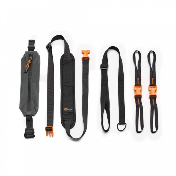 Zestaw paska akcesoriów GearUp zawiera 5 elementów: uchwyt na smartfona, pasek na ramię/na szyję, elastyczny pasek i dwa łączniki paska. Uchwyt na smartfona można przymocować do paska na ramię Lowepro plecaka lub używać z elastycznym paskiem do noszenia jako saszetka biodrowa . tenpasek na ramię można przymocować za pomocą łączników paska do pudełka z aparatem GearUp (brak w zestawie) lub bezpośrednio do aparatu. Dwa łączniki paska umożliwiają przymocowanie aparatu lub pudełka z aparatem GearUp do paska na ramię plecaka Lowepro.