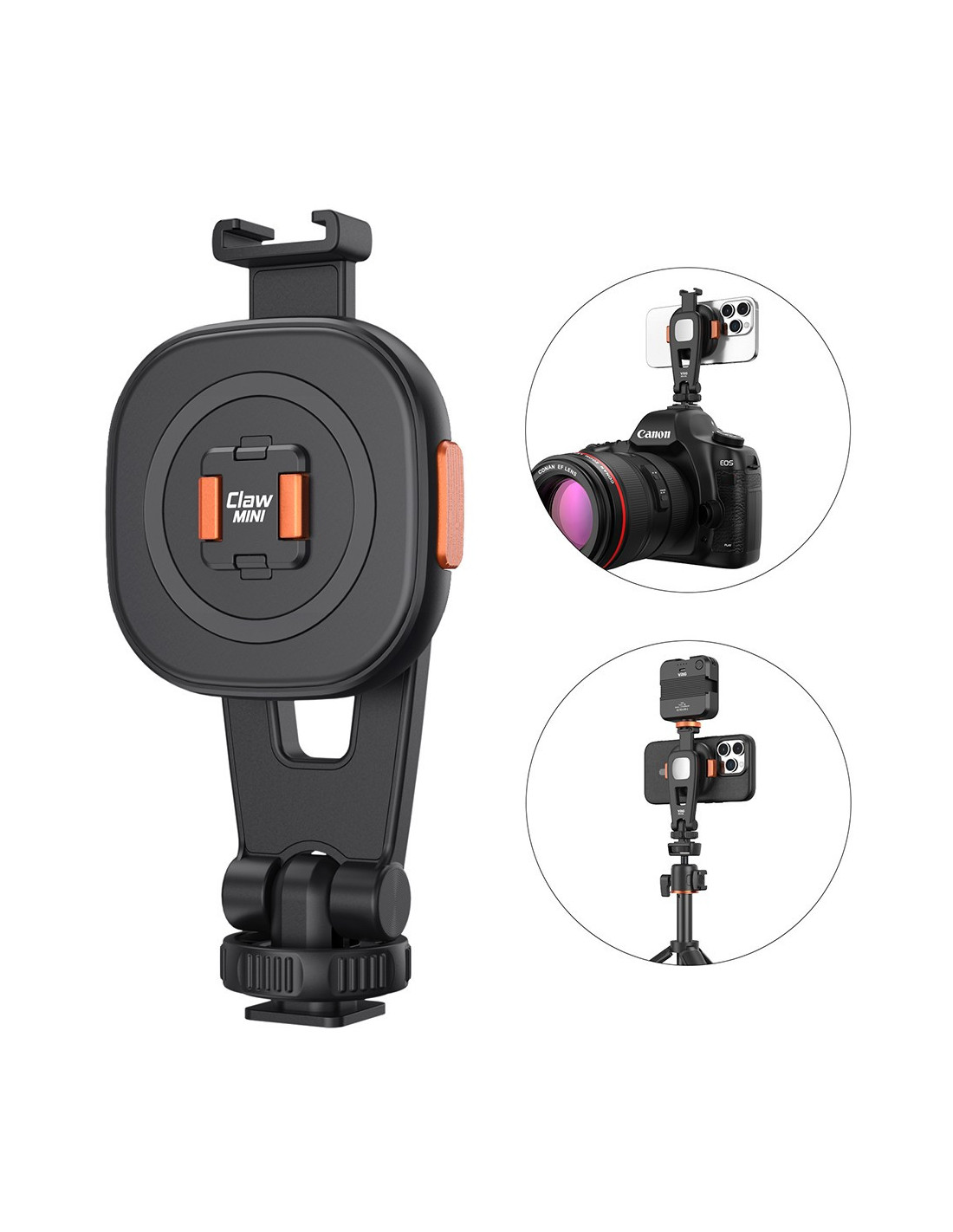 VRIG MG-03L to wszechstronny uchwyt do smartfona, umożliwiający montaż na statywach fotograficznych oraz w uchwytach typu zimna stopka. Dzięki magnetyczno-mechanicznemu systemowi montażu Claw Mini, przymocowanie i zablokowanie telefonu w wybranej pozycji jest szybkie i bezpieczne. Uchwyt posiada regulację kąta nachylenia, dodatkowe mocowanie zimna stopka.