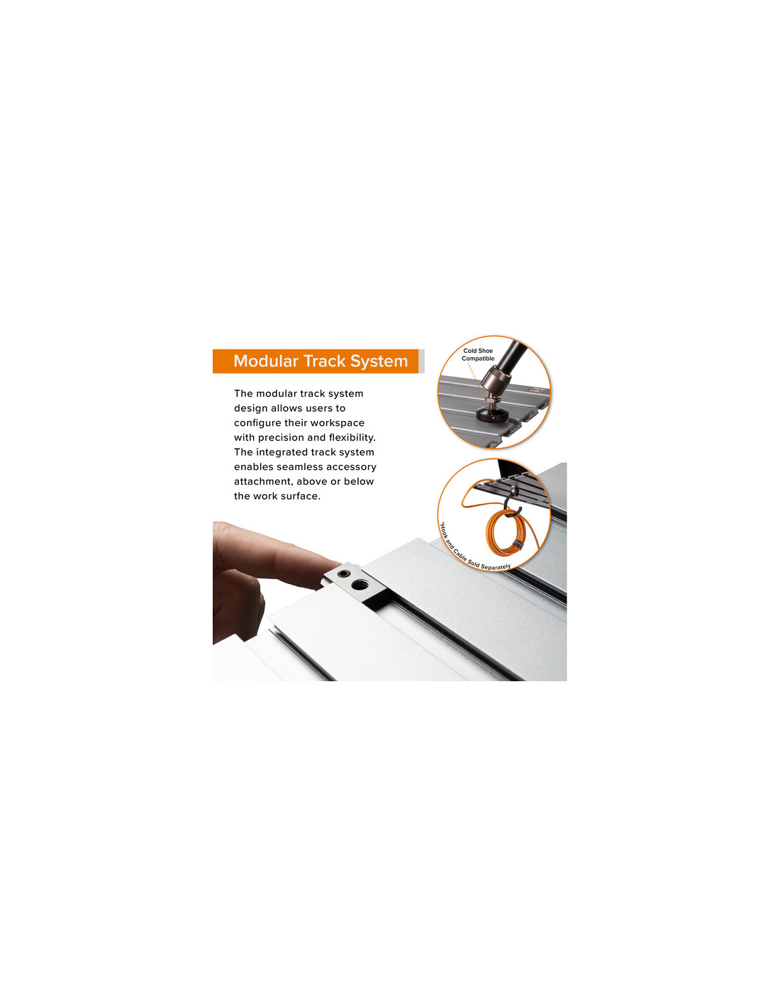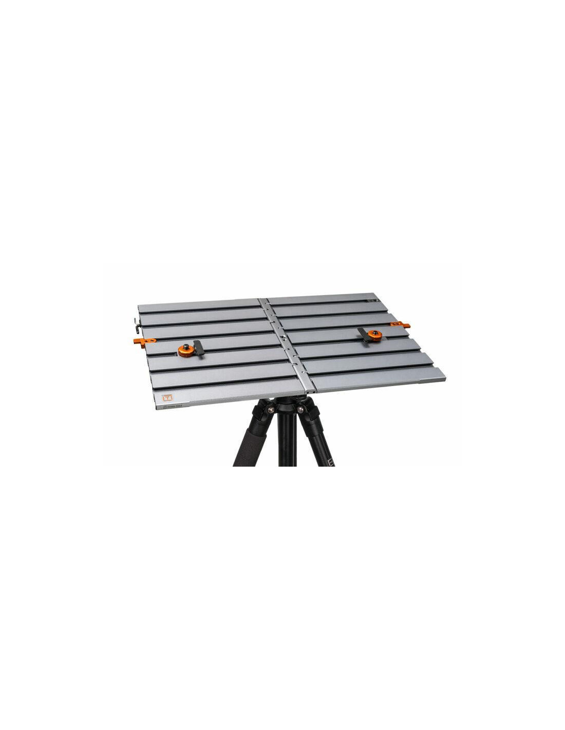 Stacja robocza AeroTrac posiada zintegrowany system szyn, zarówno nad, jak i pod powierzchnią, umożliwiający płynne mocowanie akcesoriów, co pozwala użytkownikom na stworzenie spersonalizowanej konfiguracji. Dołączone zaciski techniczne zabezpieczają laptopa lub tablet, a ruchome gwinty 1/4"-20 umożliwiają podłączenie dodatkowych monitorów, lamp, głośników i innych narzędzi w razie potrzeby. Lekki uchwyt wsuwa się w szynę na stole, ułatwiając przenoszenie, a dołączone narzędzie sześciokątne pasuje do każdej szyny, umożliwiając szybką regulację. Dzięki temu sprzęt pozostaje na swoim miejscu podczas montażu, demontażu i transportu, co pozwala na nieprzerwany przepływ pracy, a sprzęt, zasilanie, pamięć masowa i narzędzia pozostają tam, gdzie są potrzebne.