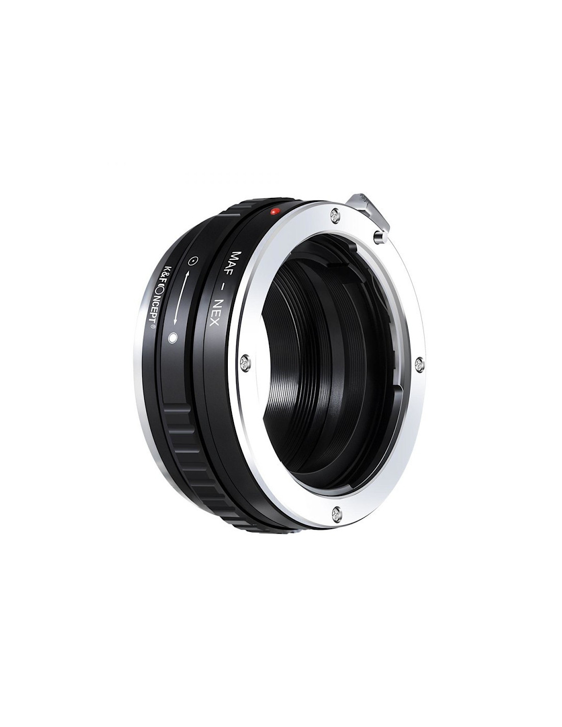 Aluminiowy, manualny adapter bagnetowy K&F Concept umożliwiający podpięcie obiektywów z mocowaniem Sony A-mount / Minolta MAF do aparatów z bagnetem Sony E-mount (seria NEX / Alpha). Pozwala na ostrzenie w pełnym zakresie, także na nieskończoność.
