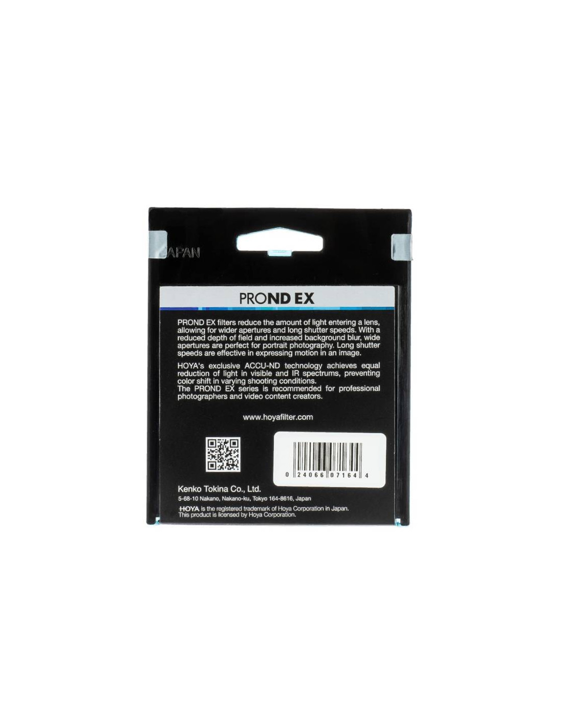 Marka Hoya posiada szeroką gamę filtrów ND z serii PRO ND EX, przeznaczonych zarówno dla fotografów, jak i filmowców. W filtrach PRO ND EX zastosowano przeźroczyste szkło optyczne Hoya, które zostało umieszczone w niezwykle lekkiej aluminiowej oprawie. Ramka posiada przedni gwint, dzięki czemu można do niej zamocować dodatkowe filtry lub osłonę obiektywu. Wysoka jakość szkła optycznego filtrów serii PRO ND w połączeniu z technologią ACCU-ND zapewnia dodatkowo wyjątkowy komfort użytkownikom. Podczas rejestracji zdjęć w dynamicznie zmieniających się warunkach oświetleniowych, wymagających zastosowania filtrów o różnym stopniu przepuszczalności, nie trzeba korygować balansu bieli w aparacie ani stosować dodatkowej obróbki cyfrowej zdjęć i filmów, by skorygować barwy obrazu, co często zdarza się przy użyciu tańszych filtrów szarych innej produkcji.