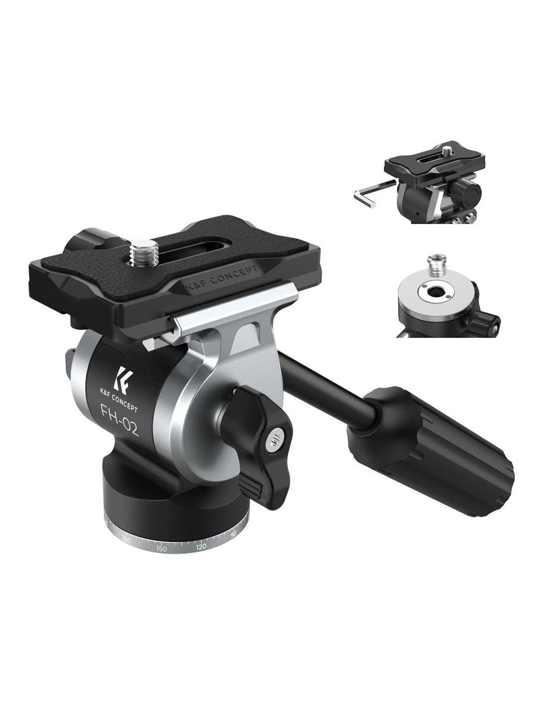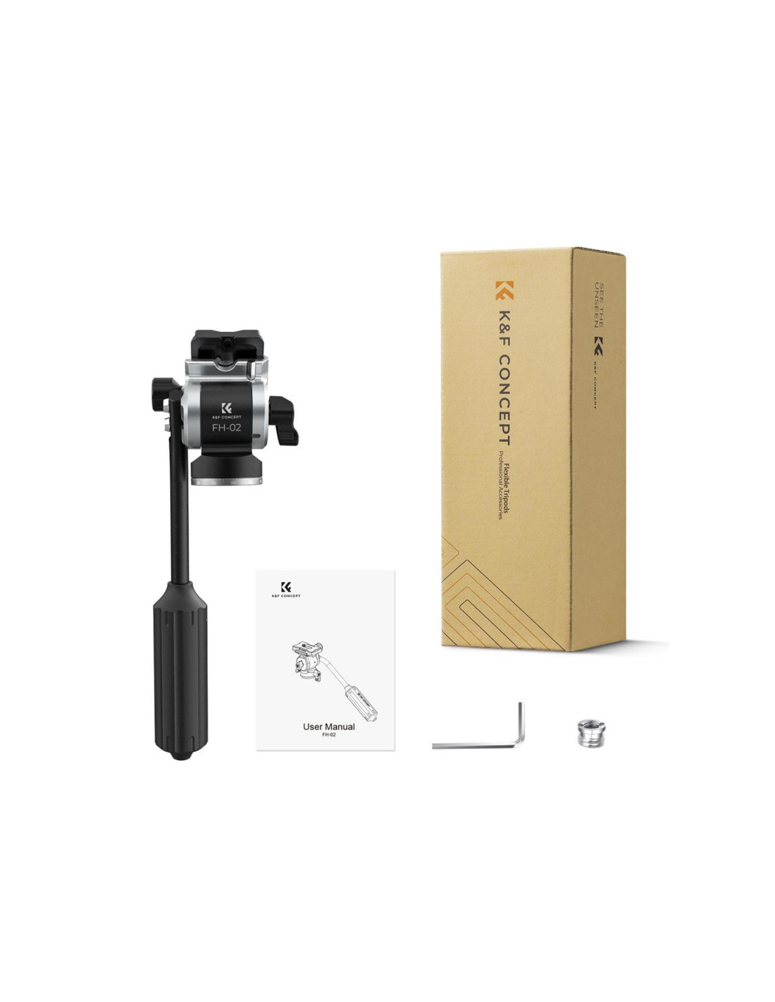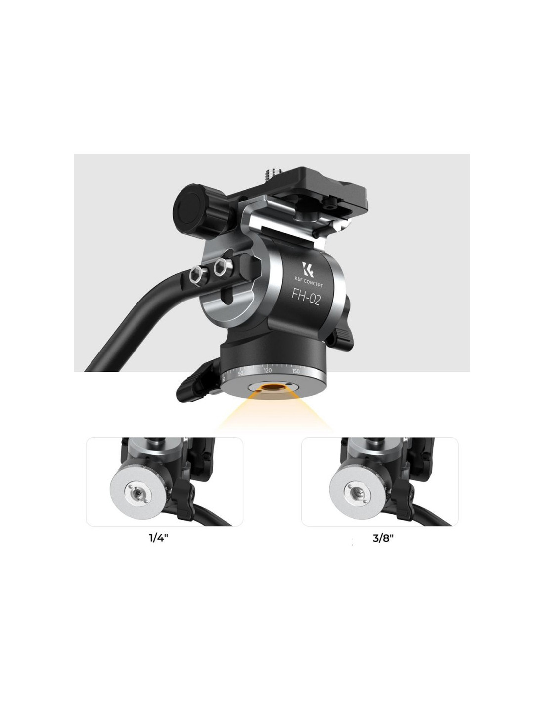 Głowica FH-02 została zaprojektowana z myślą o statywach fotograficznych, monopodach i sliderach z gwintem 3/8''. Do kompletu dołączono redukcję gwintową, umożliwiającą przejście na 1/4'' oraz klucz imbusowy.