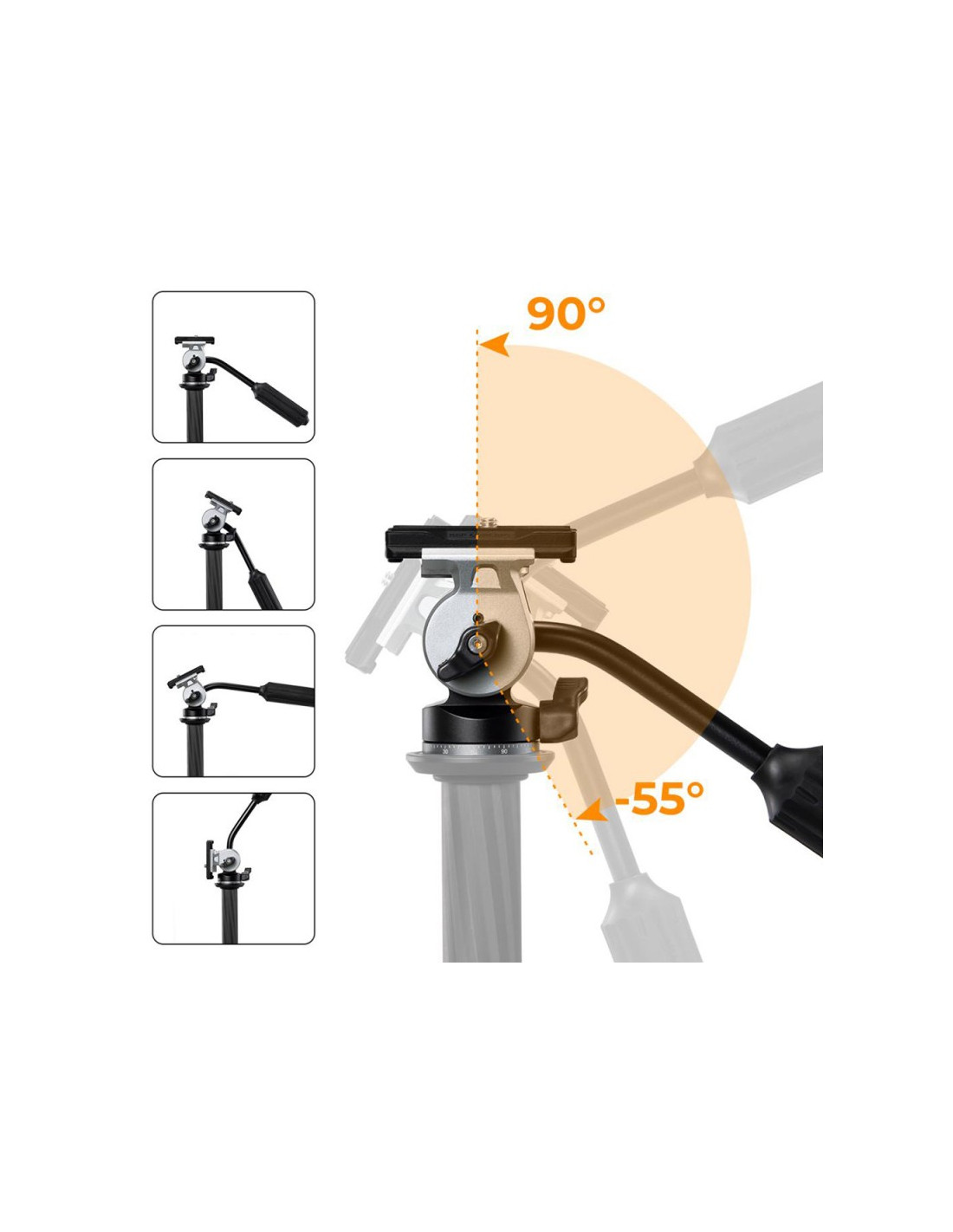 Zmiana jej położenia jest regulowana w dwóch płaszczyznach - głowica może być obracana wokół własnej osi o pełne 360° oraz odchylana do przodu i do tyłu w zakresie od -55° do +95°. Wykonywanie płynnych ujęć ułatwia podziałka kątowa. Model FH-02 posiada odpinaną szybkozłączkę w standardzie Arca Swiss. Płytka montażowa zakończona została standardowym gwintem fotograficznym 1/4", powszechnie stosowanym w aparatach, uchwytach do telefonów czy adapterach do kamer sportowych. Antypoślizgowa warstwa gumy dodatkowo zabezpiecza sprzęt stabilizując go i chroniąc przed przypadkowymi zarysowaniami.