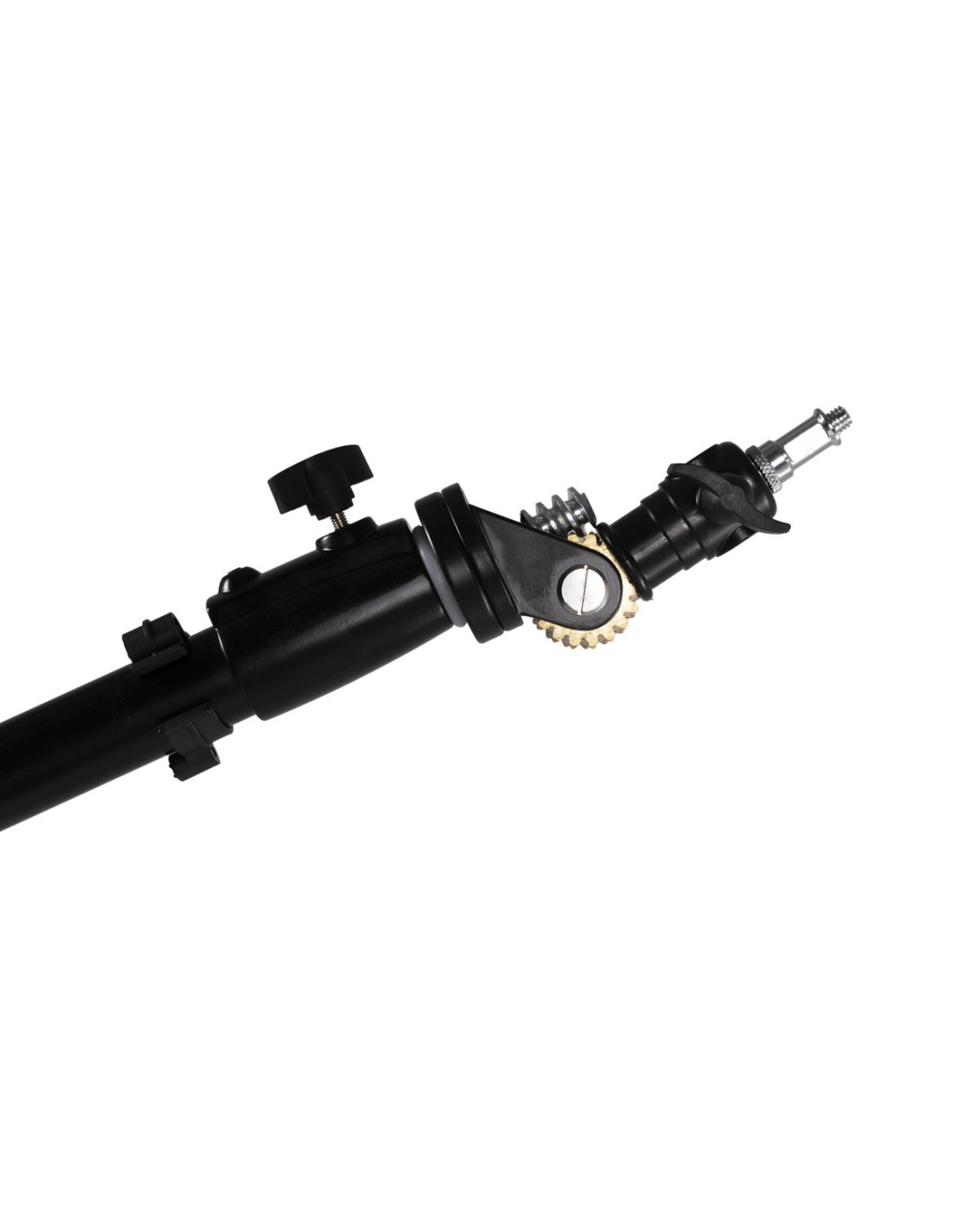 Statyw jest wyposażony w ruchomu trzpień. Dzięki pokrętle na końcu ramienia Boom, możemy wygodnie operować lampą umieszczoną na drugim końcu ramienia: pochylić ją, wyprostować czy skierować ku górze.