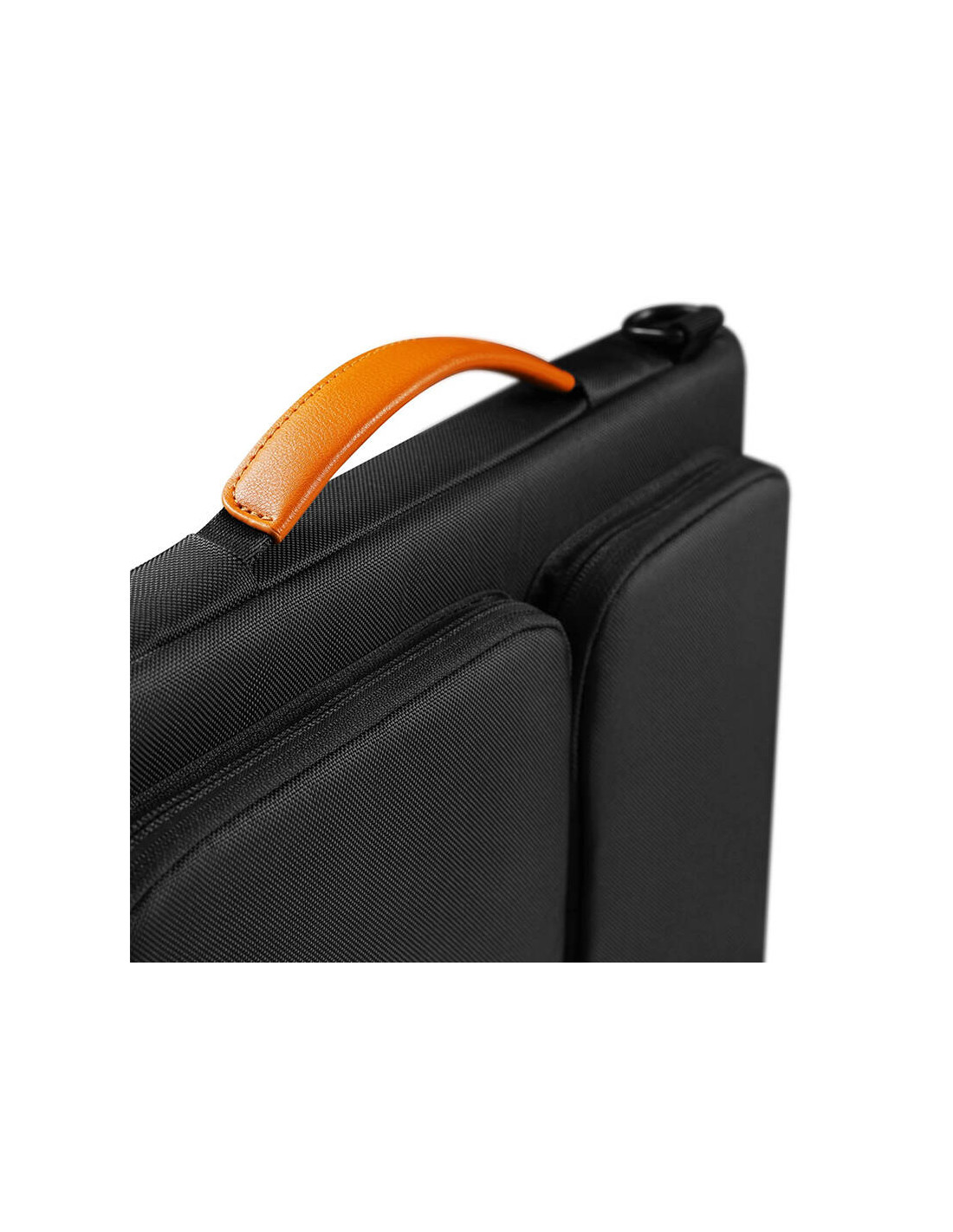Z przodu znajdują się pojemne kieszenie zapinane na zamek - jedna większa, druga mniejsza. W środku znajduje się dodatkowy zaczep na klucze i/lub AirTag. Wszyte zamki wyprodukowane zostały przez YKK - znaną i cenioną japońską markę. Tyna kieszeń fantastycznie sprawdzi się na dokumenty czy zeszyt. Materiał pokrowca pochodzi z recyklingu plastikowych butelek. Pokrowiec cechuje się eleganckim, minimalistycznym designem. Teczka posiada wygodną rączkę wykończoną sztuczną skórą.