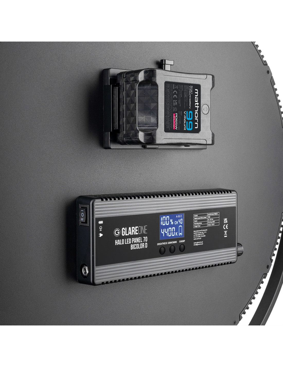 Lampę GlareOne Halo LED Panel 70 BiColor D można zasilać na dwa sposoby - poprzez gniazdko sieciowe przy użyciu dołączonego adaptera zasilającego lub za pomocą akumulatorów typu V-mount. Używając akumulatora typu V-mount 98.6Wh, lampa będzie świecić na 100% mocy przez około 80 minut.