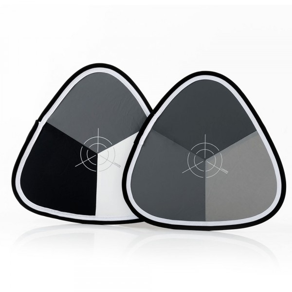 Trójkątna karta XpoBalance służy do ustawienia prawidłowej ekspozycji oraz balansu bieli. Po jednej stronie karty są pola białe, szare 18% i czarne. Po drugiej stronie karty mamy pole szare 18% oraz pole jaśniejsze i ciemniejsze +/-1EV. Celownik umieszczony po środku karty ułatwia ustawienie ostrości.