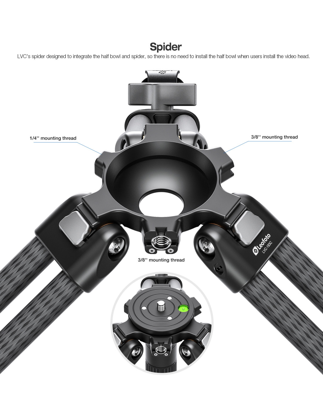 Pająk w statywach LVC został zaprojektowany tak, żeby zintegrować w sobie pół głowice i tradycyjnego pająka, nie ma więc potrzeby instalowania dodatkowej pół głowicy, gdy montujemy głowicę wideo.