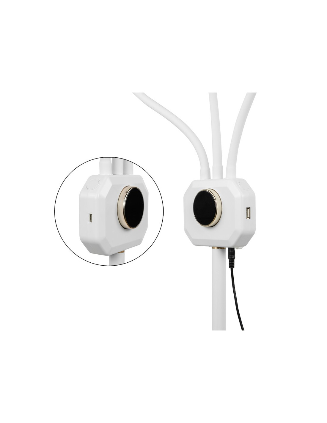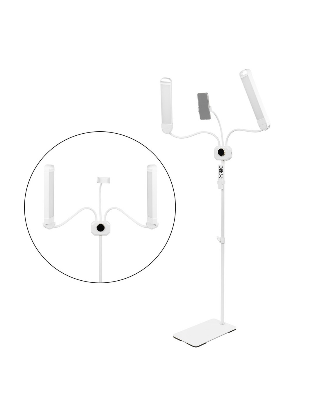 Lampa LUMERA posiada w komplecie statyw podłogowy z szeroką, stabilną podstawą. Wysokość statywu jest regulowana w zakresie 54-108 cm. Z panelami LED ustawionymi pionowo, lampa osiąga wysokość całkowitą niemal 180 cm, dzięki czemu z łatwością może doświetlać leżące, siedzące, a nawet stojące stanowisko pracy. Sama podstawa o wymiarach 37 × 21,5 cm posiada dodatkowo antypoślizgowe stopki. W komplecie znajdziemy też uchwyt do pilota, który możemy przyczepić na kolumnie statywu.