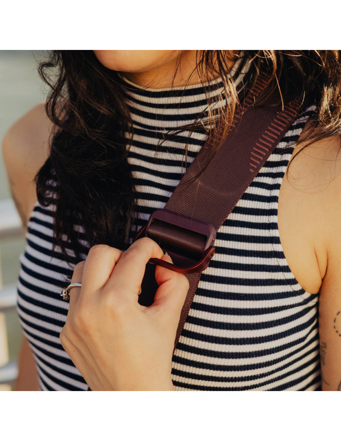 Slide możesz nosić na ramieniu, na szyi lub przez plecy. Silikonowe elementy na jednej stronie paska zapewniają, że nie zsuwa się on z ramienia, a gładka strona ułatwia przesuwanie paska po ubraniu, zapewniając wygodę przy noszeniu na szyi. Szybka regulacja długości za pomocą aluminiowych uchwytów umożliwia wygodne przełożenie paska przez ramię lub noszenie go jak torby typu Sling.