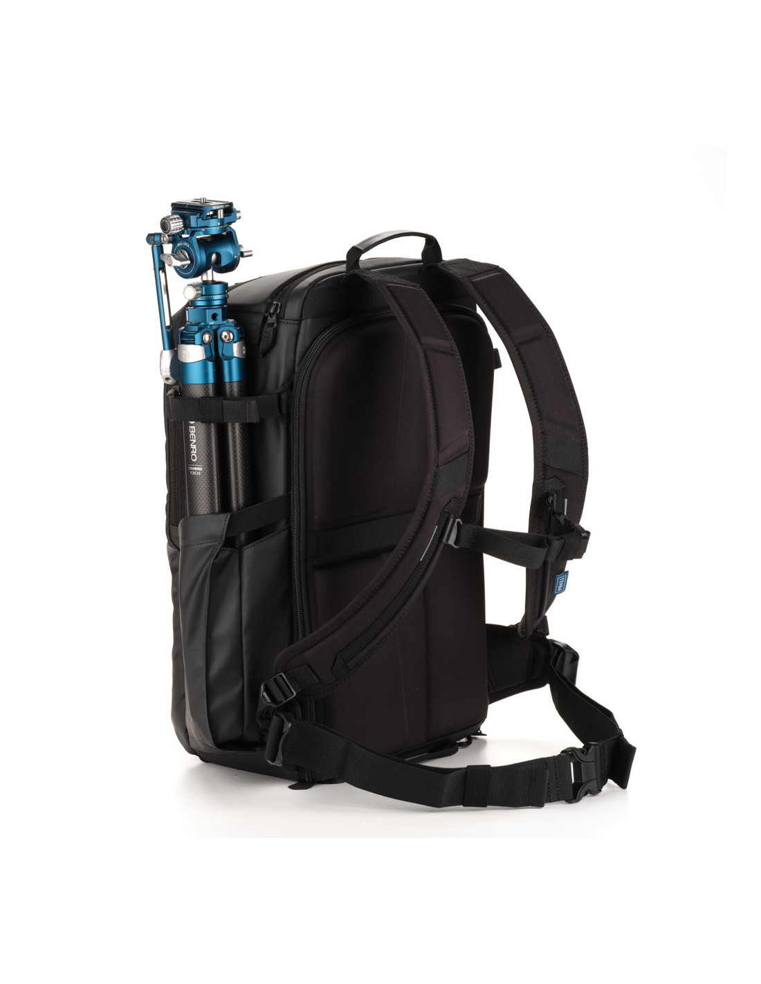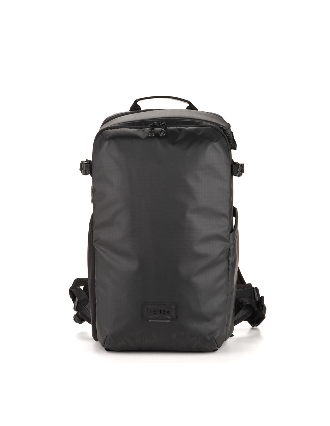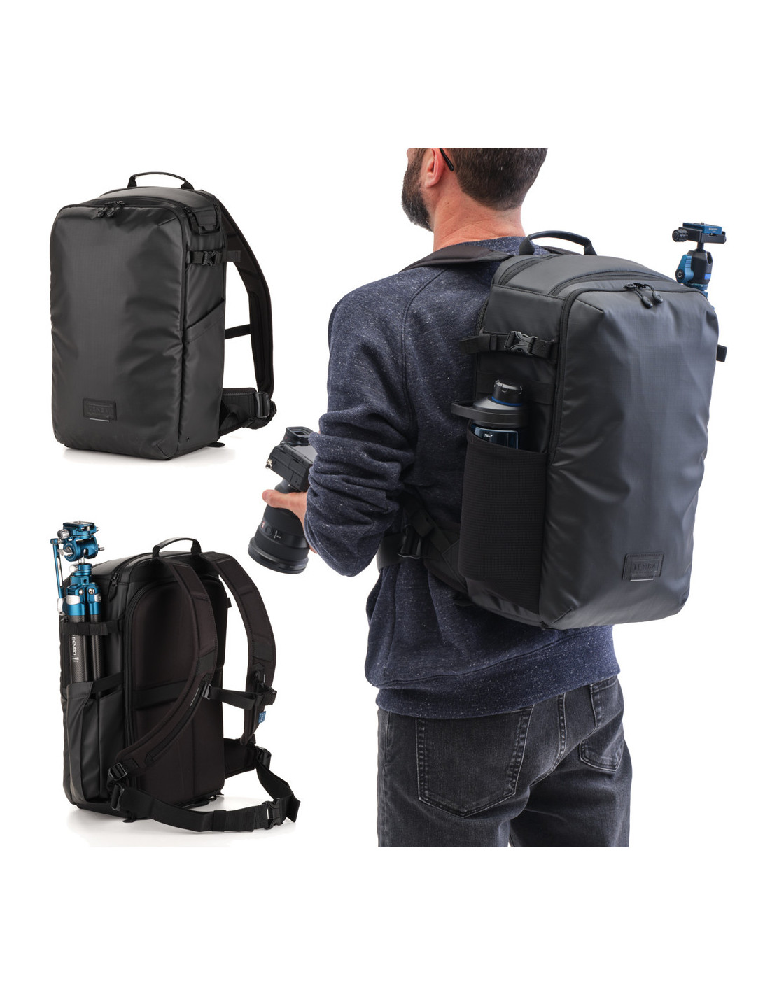 Czarny plecak Solstice V2 firmy Tenba pomieści aparat, obiektywy i akcesoria. Plecak ma pojemność 20 litrów, dzięki czemu pomieści dwa aparaty bezlusterkowe lub lustrzanki cyfrowe i osiem obiektywów, w tym aparat i obiektyw o długości do 16,5 cala. Dedykowana kieszeń chroni 14-calowego laptopa, a wzmocniona kieszeń boczna umożliwia przechowywanie statywu lub gimbala. Dwa przekładane paski mocujące pozwalają przymocować kurtkę do zewnętrznej części torby.