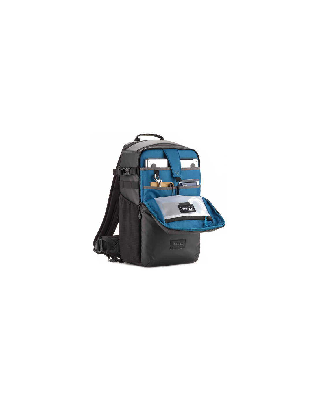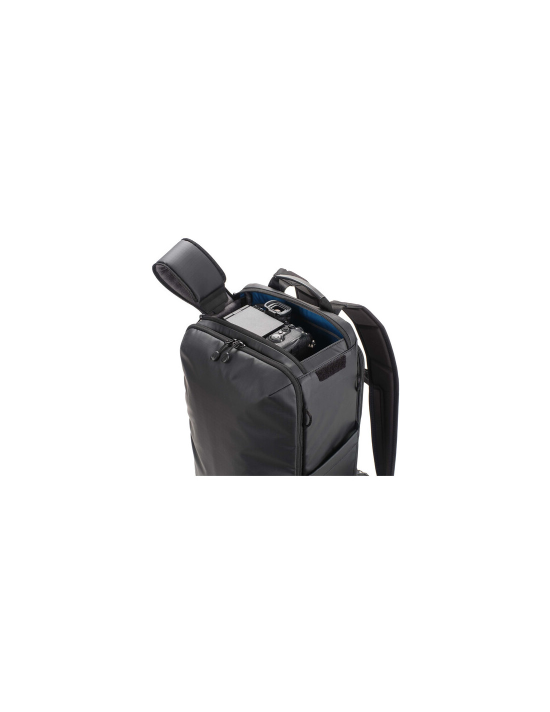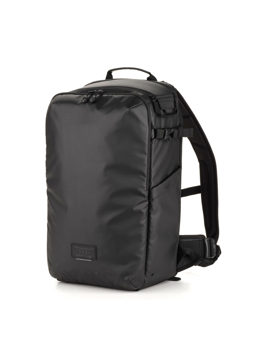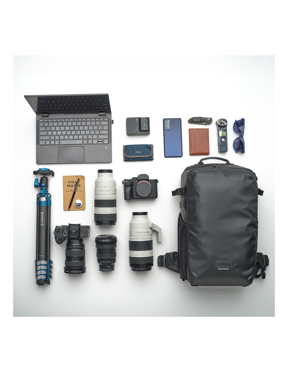 Czarny plecak Solstice V2 firmy Tenba pomieści aparat, obiektywy i akcesoria. Plecak ma pojemność 20 litrów, dzięki czemu pomieści dwa aparaty bezlusterkowe lub lustrzanki cyfrowe i osiem obiektywów, w tym aparat i obiektyw o długości do 16,5 cala. Dedykowana kieszeń chroni 14-calowego laptopa, a wzmocniona kieszeń boczna umożliwia przechowywanie statywu lub gimbala. Dwa przekładane paski mocujące pozwalają przymocować kurtkę do zewnętrznej części torby.