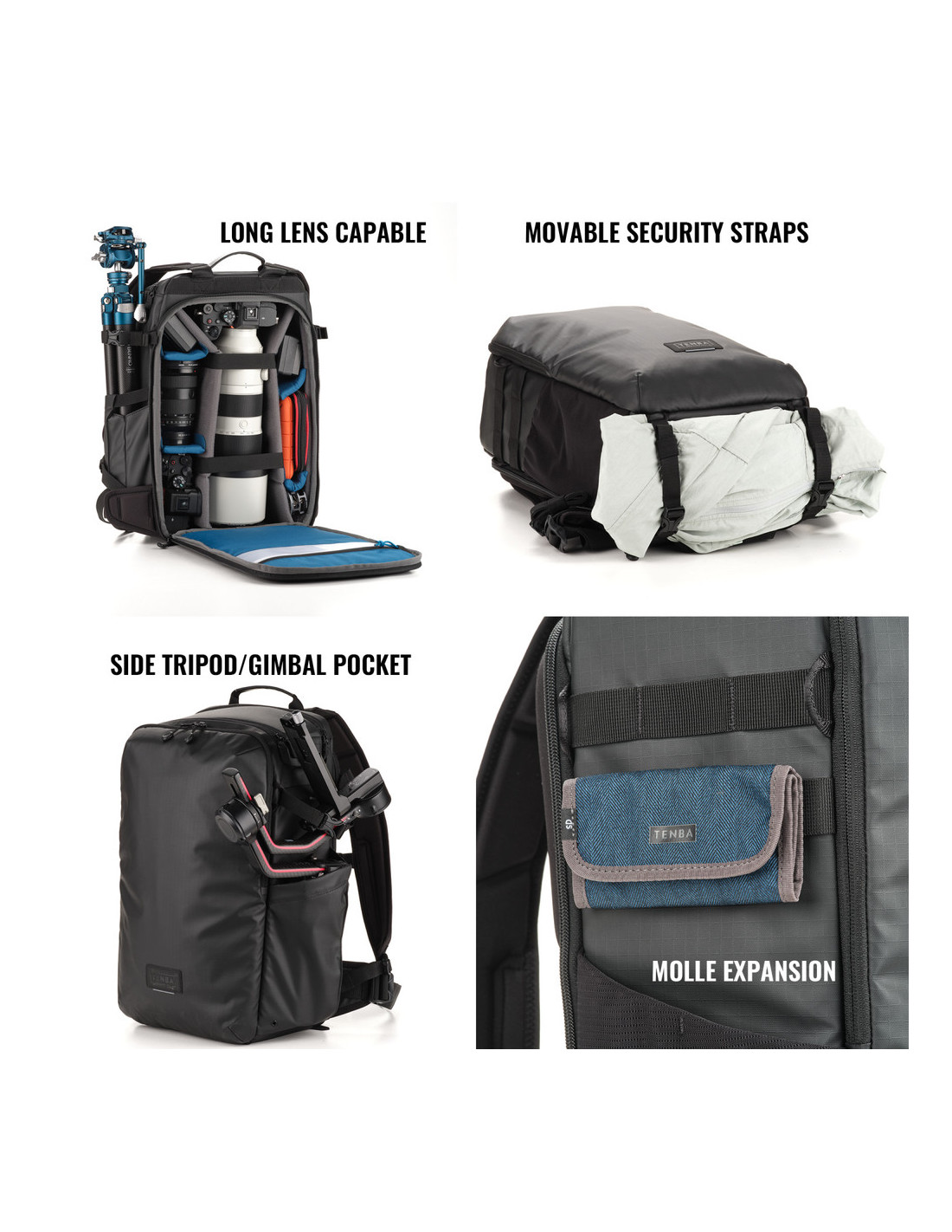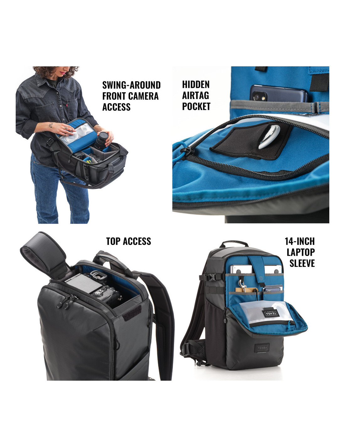 Wygodny dostęp z tyłu pozwala na bezpieczne zawieszenie plecaka na ciele, jak pływający stół warsztatowy i zapewnia, że sprzęt fotograficzny jest zabezpieczony na plecach, dzięki czemu nic nie może zostać usunięte z przodu lub po bokach plecaka podczas podróży.