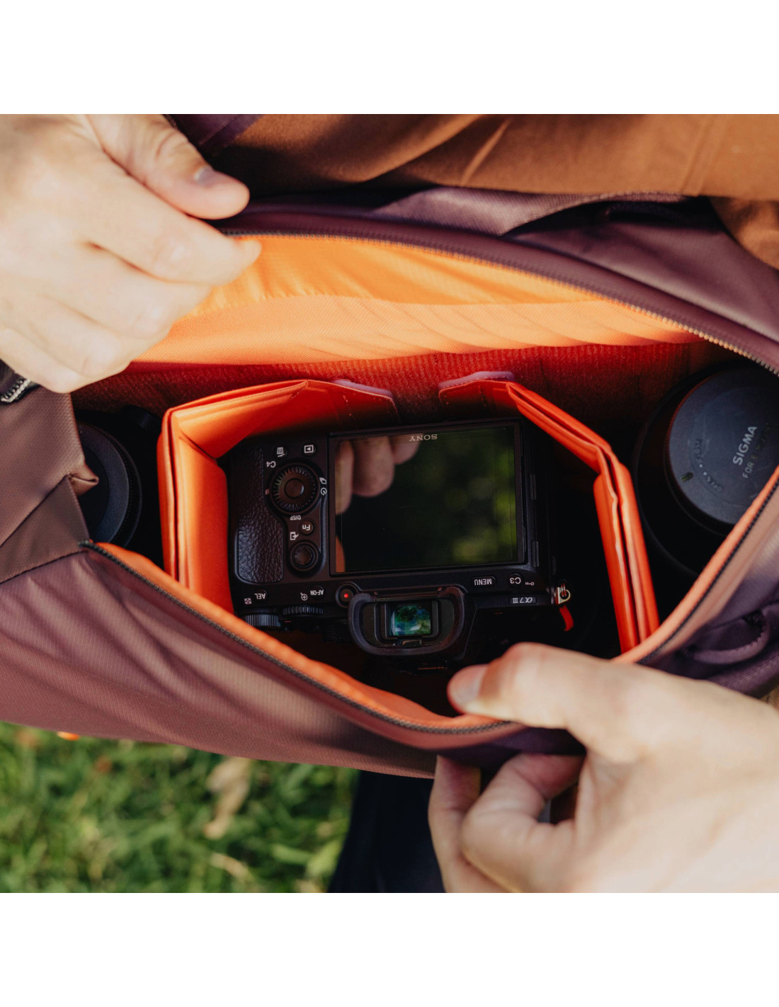 Plecak zapewnia wyjątkową wygodę użytkowania dzięki szerokiemu dostępowi do wnętrza poprzez górny zamek błyskawiczny, zabezpieczony wodoodporną osłoną. Dwa boczne zamki umożliwiają szybki dostęp do aparatu, butelki z wodą czy innych często używanych przedmiotów. Zewnętrzna, rozciągliwa kieszeń pozwala na przechowywanie drobnych przedmiotów, a wewnętrzne przegrody typu FlexFold pozwalają na personalizację wnętrza, zapewniając skuteczną ochronę dla transportowanych przedmiotów.