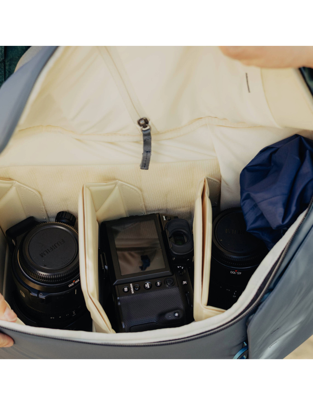 Wewnętrzne przegrody FlexFold umożliwiają elastyczną organizację przestrzeni, zapewniając bezpieczne przechowywanie sprzętu fotograficznego oraz innych przedmiotów.
