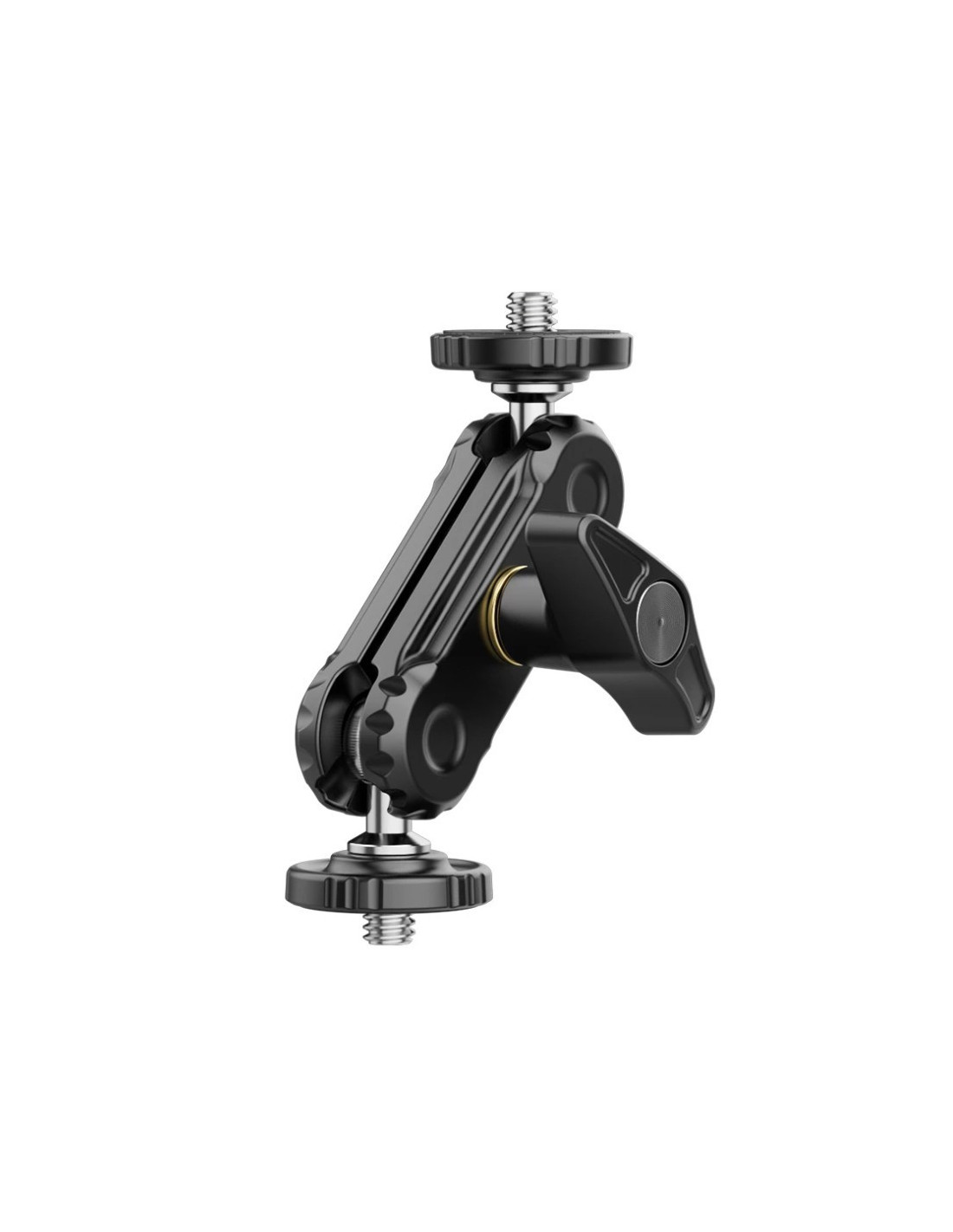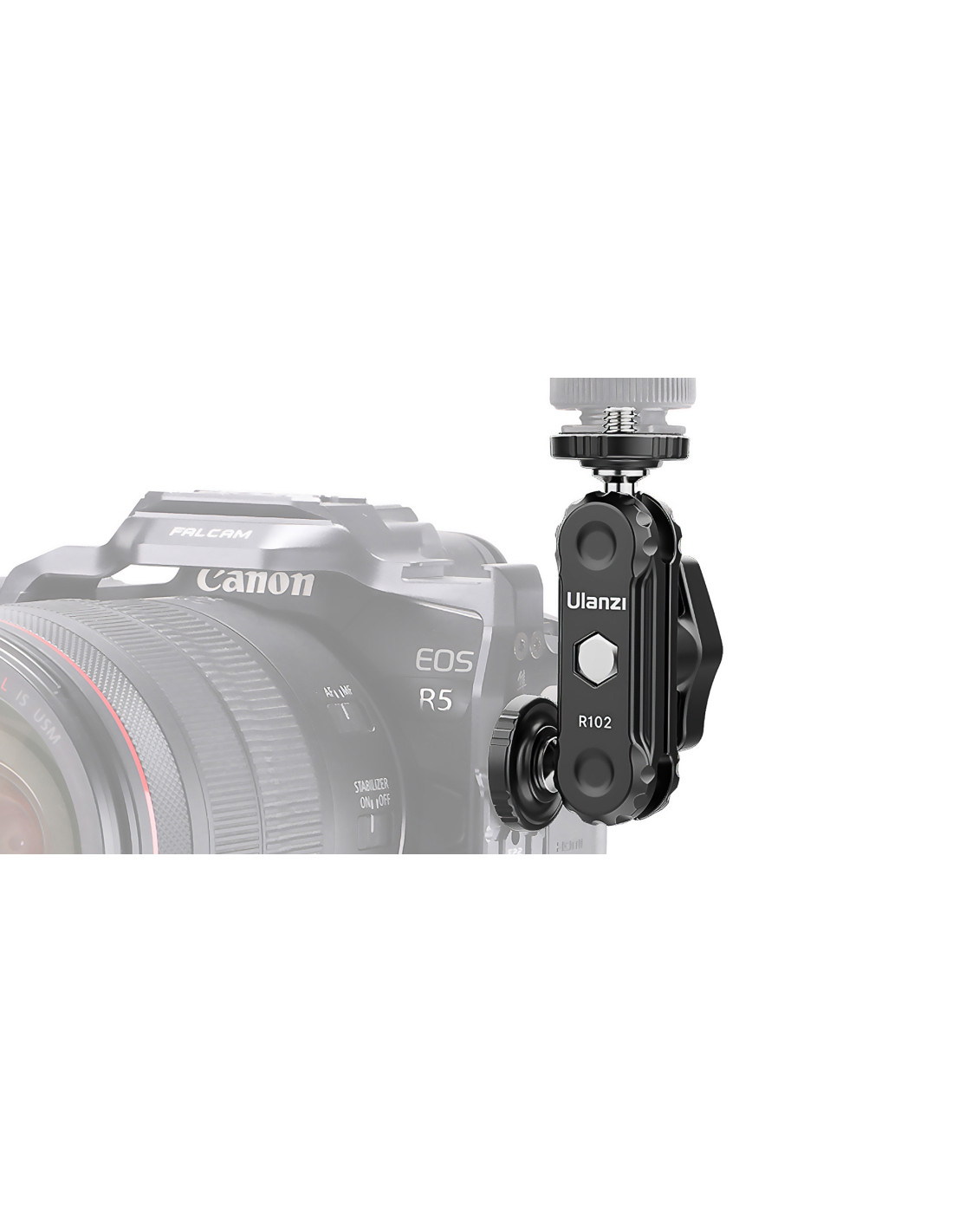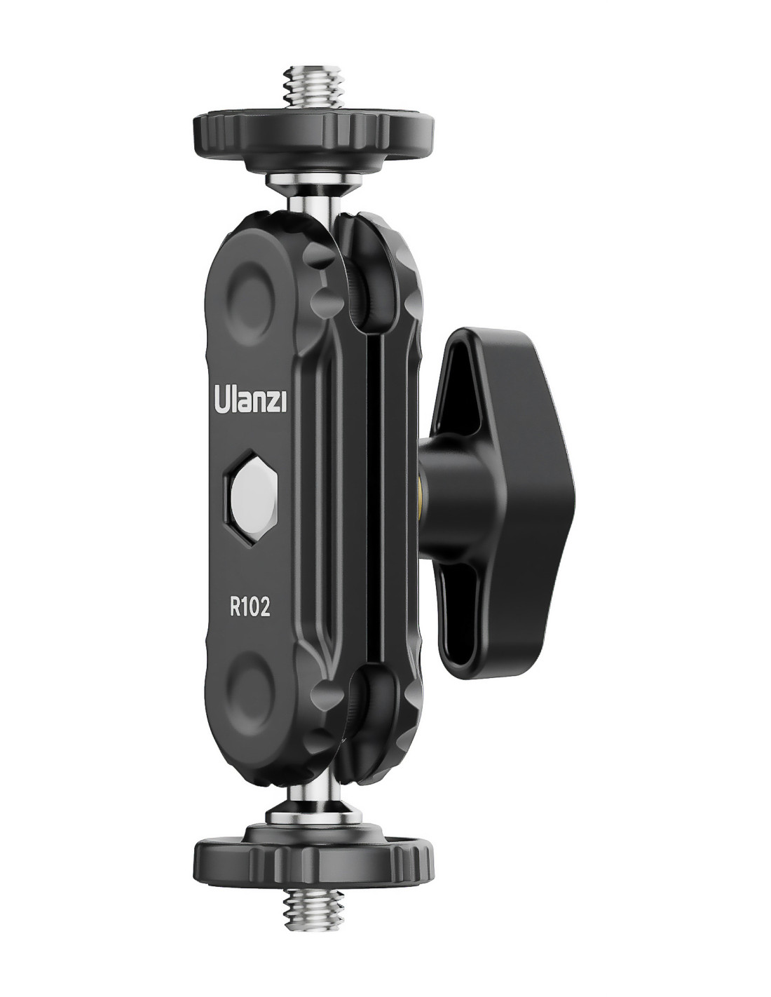 Ulanzi R102 to niewielki uchwyt przegubowy typu magic arm, zakończony z dwóch strony męskimi gwintami fotograficznymi w standardzie 1/4’’. Mierzy zaledwie 9 cm i jest wyposażony w dwa łożyska kulowe, umożliwiające niezależny obrót każdego elementu o 360° oraz jednopunktową blokadę w postaci szerokiego zacisku – motylka.