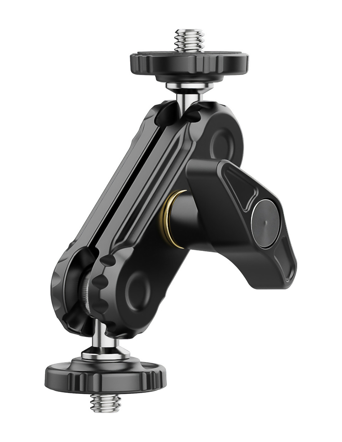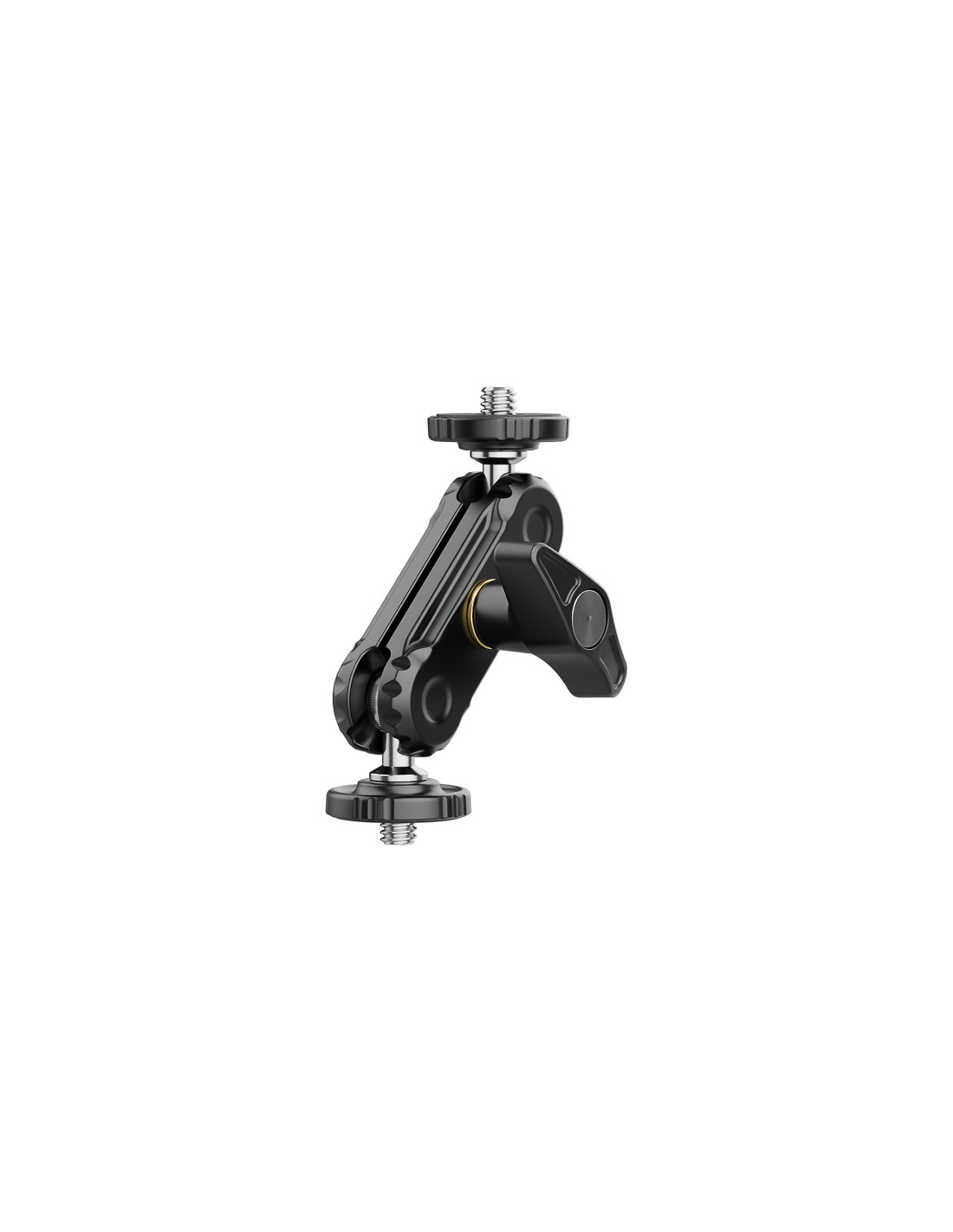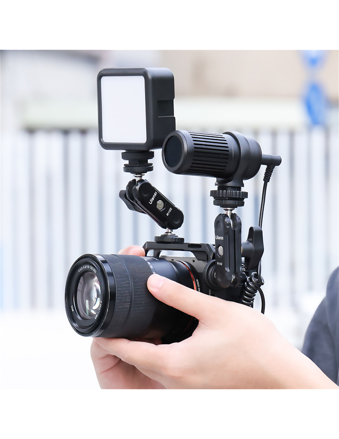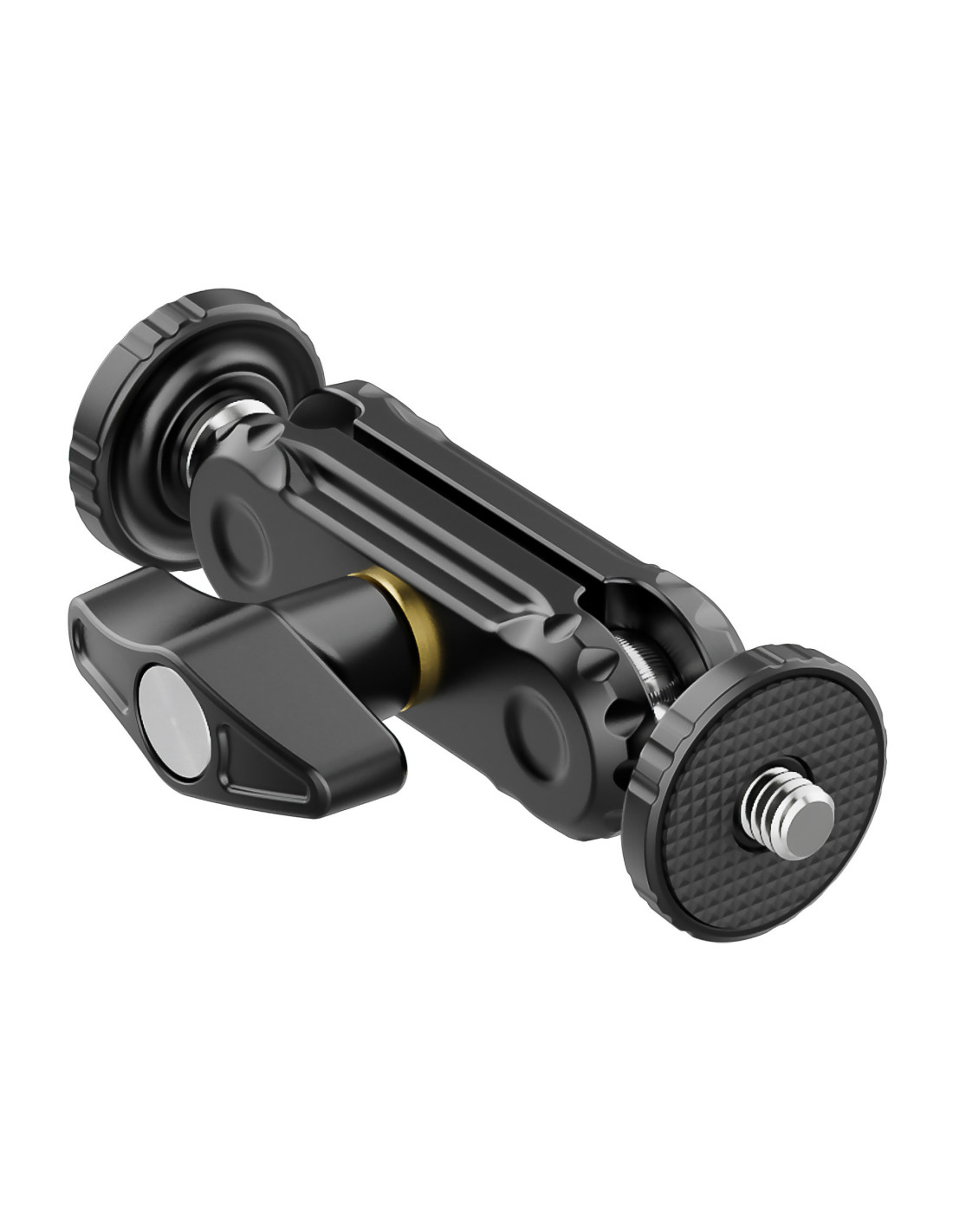 Ulanzi R102 to niewielki uchwyt przegubowy typu magic arm, zakończony z dwóch strony męskimi gwintami fotograficznymi w standardzie 1/4’’. Mierzy zaledwie 9 cm i jest wyposażony w dwa łożyska kulowe, umożliwiające niezależny obrót każdego elementu o 360° oraz jednopunktową blokadę w postaci szerokiego zacisku – motylka.