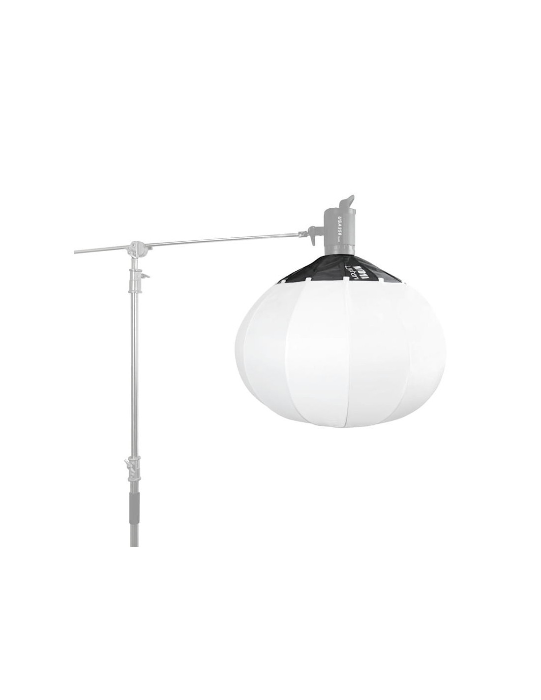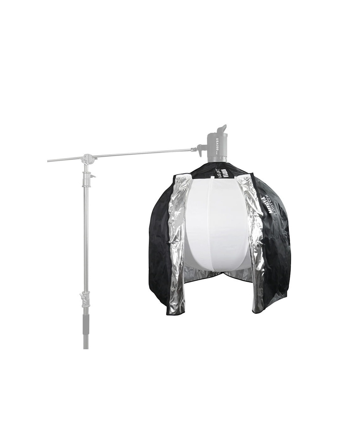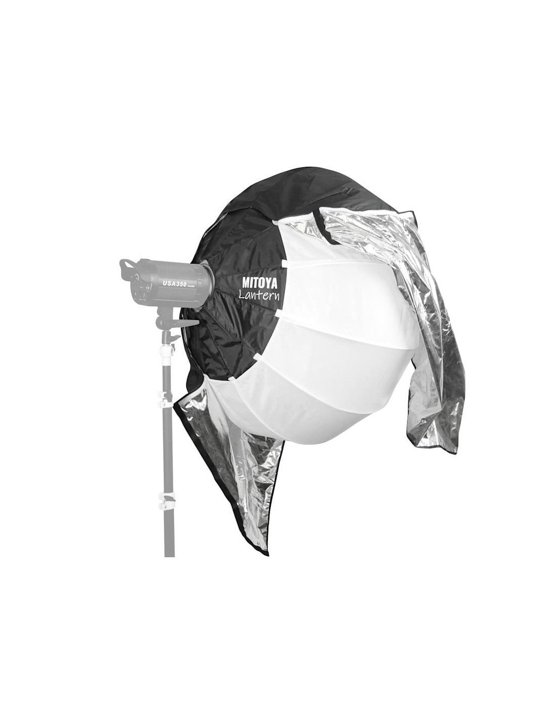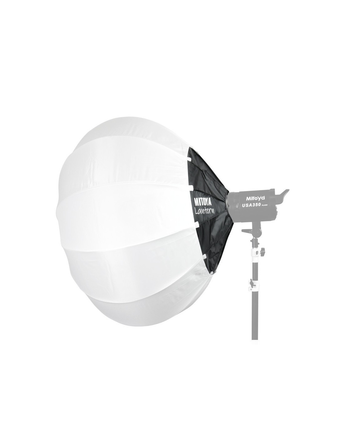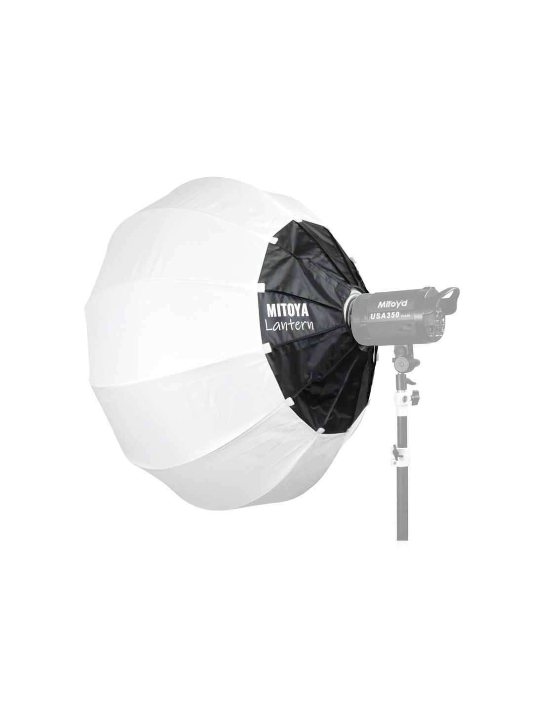 Sferyczny softbox studyjny MITOYA LANTERN to wyjątkowy modyfikator światła, dzięki któremu możliwe jest uzyskanie równomiernego, miękkiego i naturalnego oświetlenia szerokich planów zdjęciowych i filmowych. Wyjątkowy kształt czaszy, przypominający sufitowy lampion, umożliwia rozproszenie wiązki światła pod kątem aż 270°, co pozwala ograniczyć do minimum ilość lamp na planie zdjęciowym. Średnica czaszy wynosi 85 cm, zaś jej głębokość to 70 cm – przy tych wymiarach LANTERN z łatwością rozproszy światło lampy nawet na dużej powierzchni studyjnej czy w otwartym terenie.