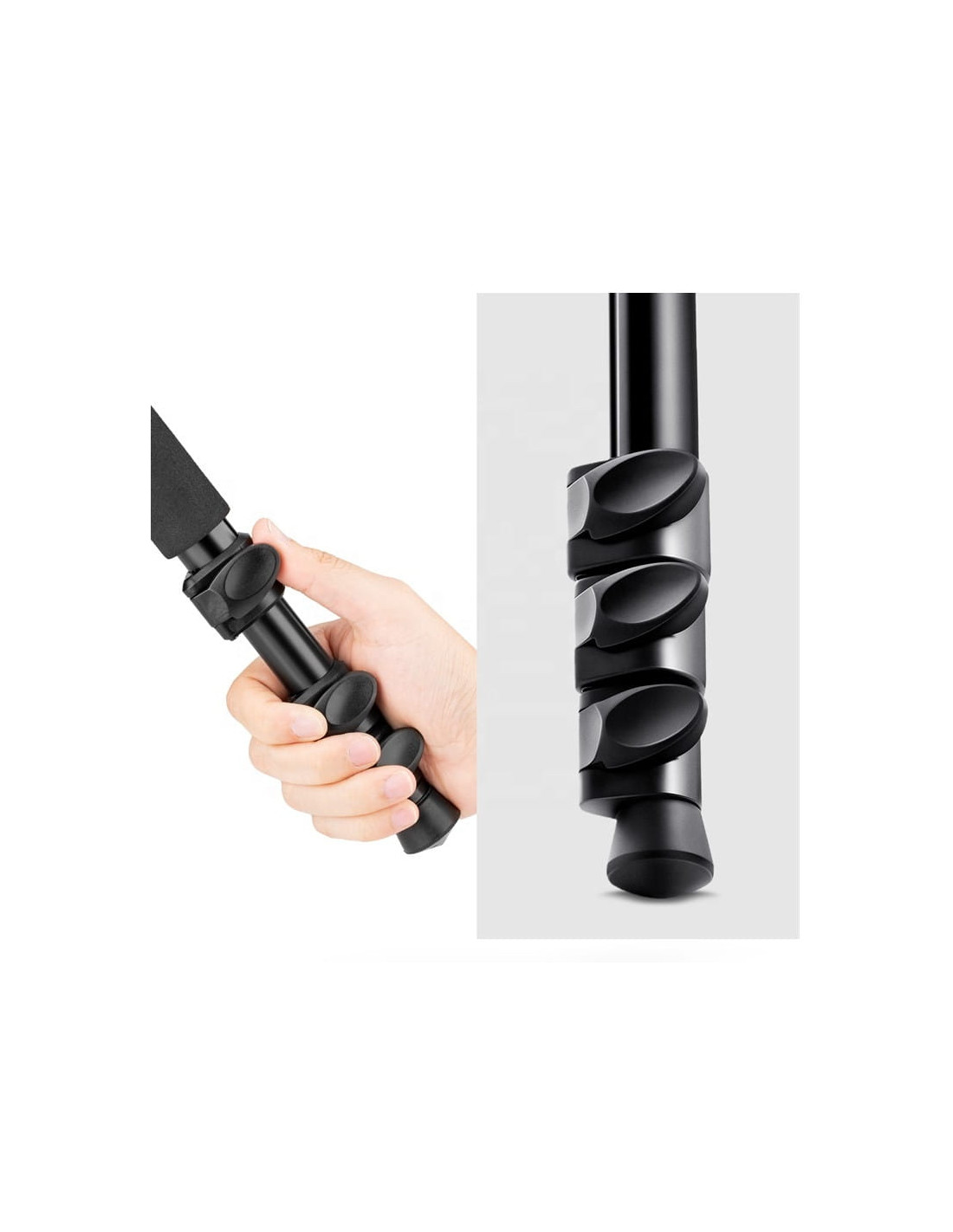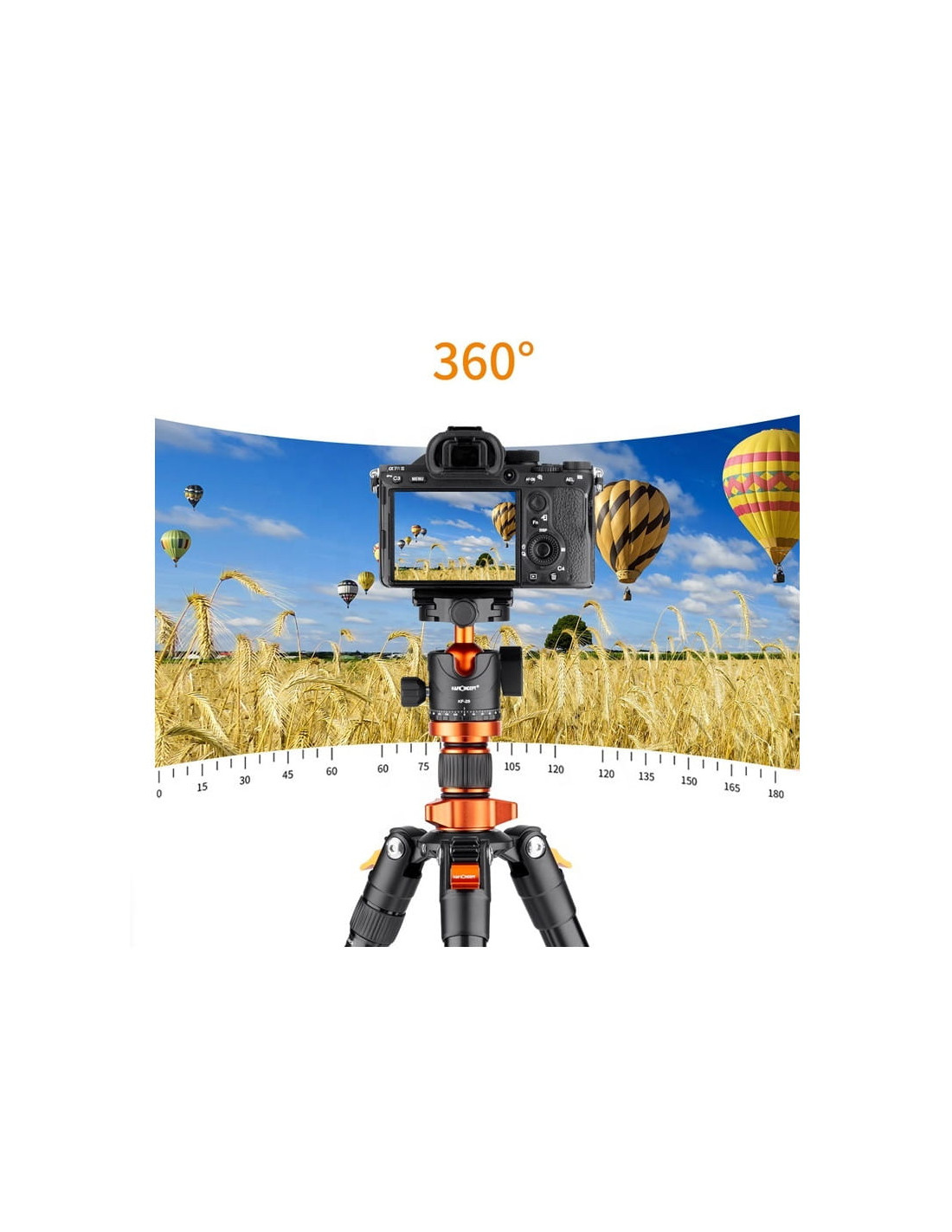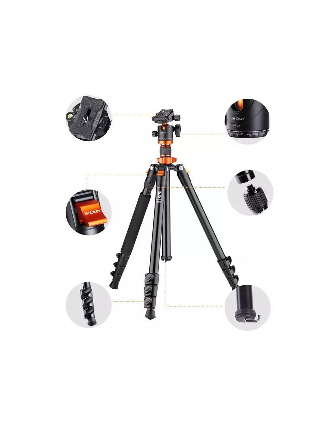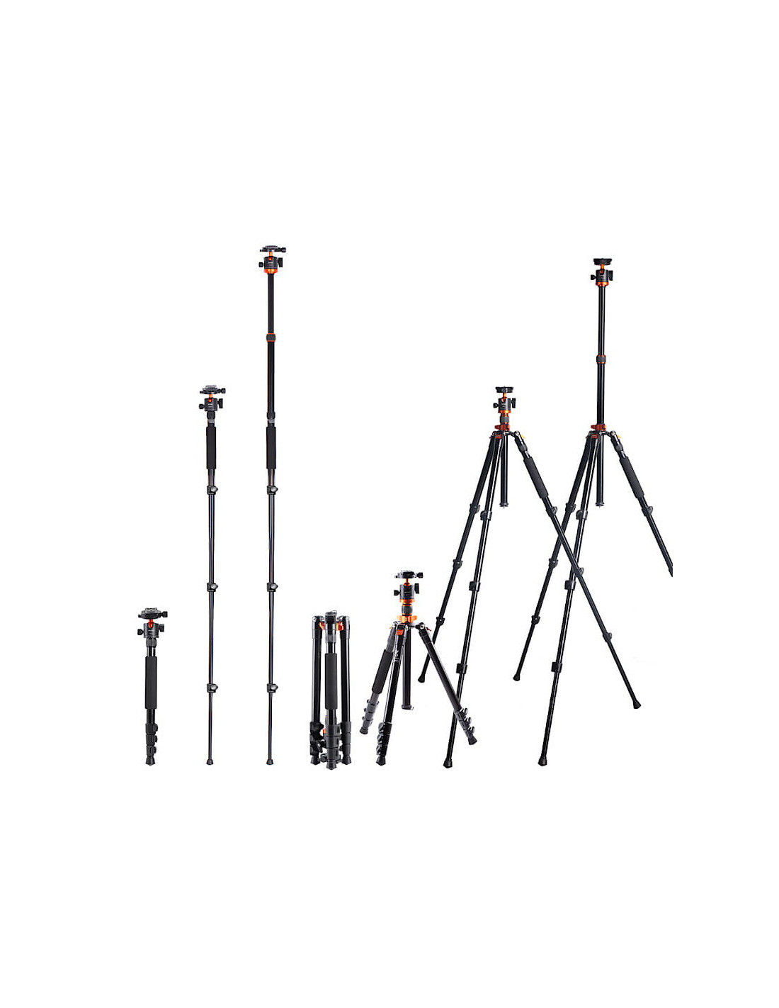 Solidny statyw fotograficzny K&F Concept SA254M2 o wysokości 170 cm z głowicą kulową. Jego nóżki są składane w drugą stronę, a jedna z nich może być odkręcona i połączona z głowicą lub z całą kolumną centralną, tworząc monopod o dużej skali regulacji. Centralna kolumna może być też zamontowana odwrotnie, co pozwoli na wykonywanie zdjęć typu flat lay. Udźwig do 4 kg. W komplecie futerał.