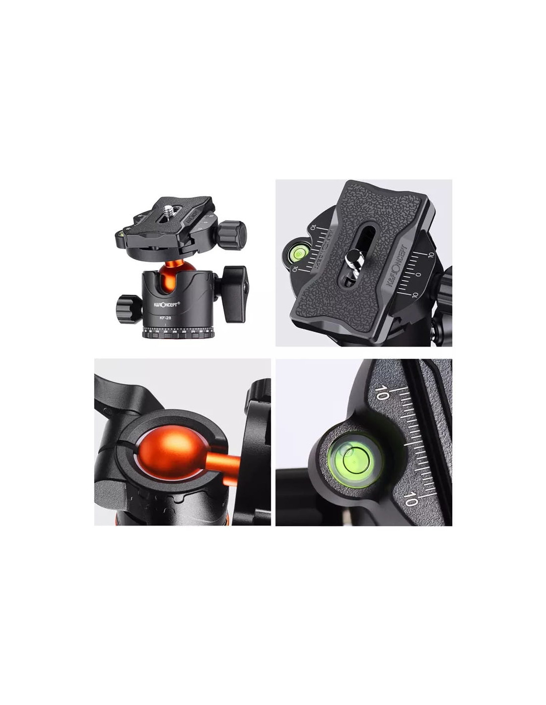 Tripod K&F Concept SA254M2 z funkcją monopodu to solidny statyw fotograficzny o maksymalnej wysokości 170 cm. Jego głowica kulowa z demontowaną szybkozłączką jest zakończona standardowym gwintem fotograficznym 1/4 cala, który pozwala na montaż kamery, aparatu bądź rozmaitych adapterów do telefonu. Sama szybkozłączka została wykonana w standardzie arca swiss, dzięki czemu na statywie można bezpośrednio montować m.in. teleobiektywy z zewnętrznym mocowaniem tego typu - np. Sigma Sport 70-200 mm f/2.8.