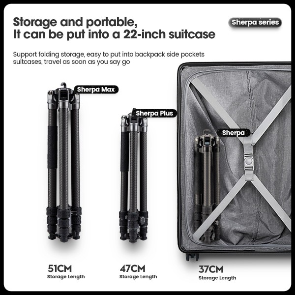 Fotopro Sherpa to najmniejszy statyw w rodzinie wielozadaniowych trójnogów wykonanych z włókna węglowego 3K, które swoją nazwą nawiązują do tybetańskiego ludu zamieszkującego m.in. Himalaje. To idealny wybór dla aktywnych fotografów, filmowców i podróżników, którzy pracują w przeróżnych warunkach terenowych i atmosferycznych. Urządzenie zapewnia wysokość roboczą w przedziale od 37 cm aż do 151 cm, ważąc zaledwie 1,07 kg. Mobilnych fotografów na pewno ucieszy uchwyt na smartfon ukryty w kolumnie centralnej, który jest kompatybilny z gwintami 1/4" oraz standardem Arca-Swiss. Statyw wyposażono w głowicę kulową z 2 poziomnicami, kontrolą panoramy i pochyłu, obrotową podstawą i podziałką 360°. W zestawie nie zabrakło też torby transportowej i unikalnego niezbędnika z dwoma kluczami imbusowymi.