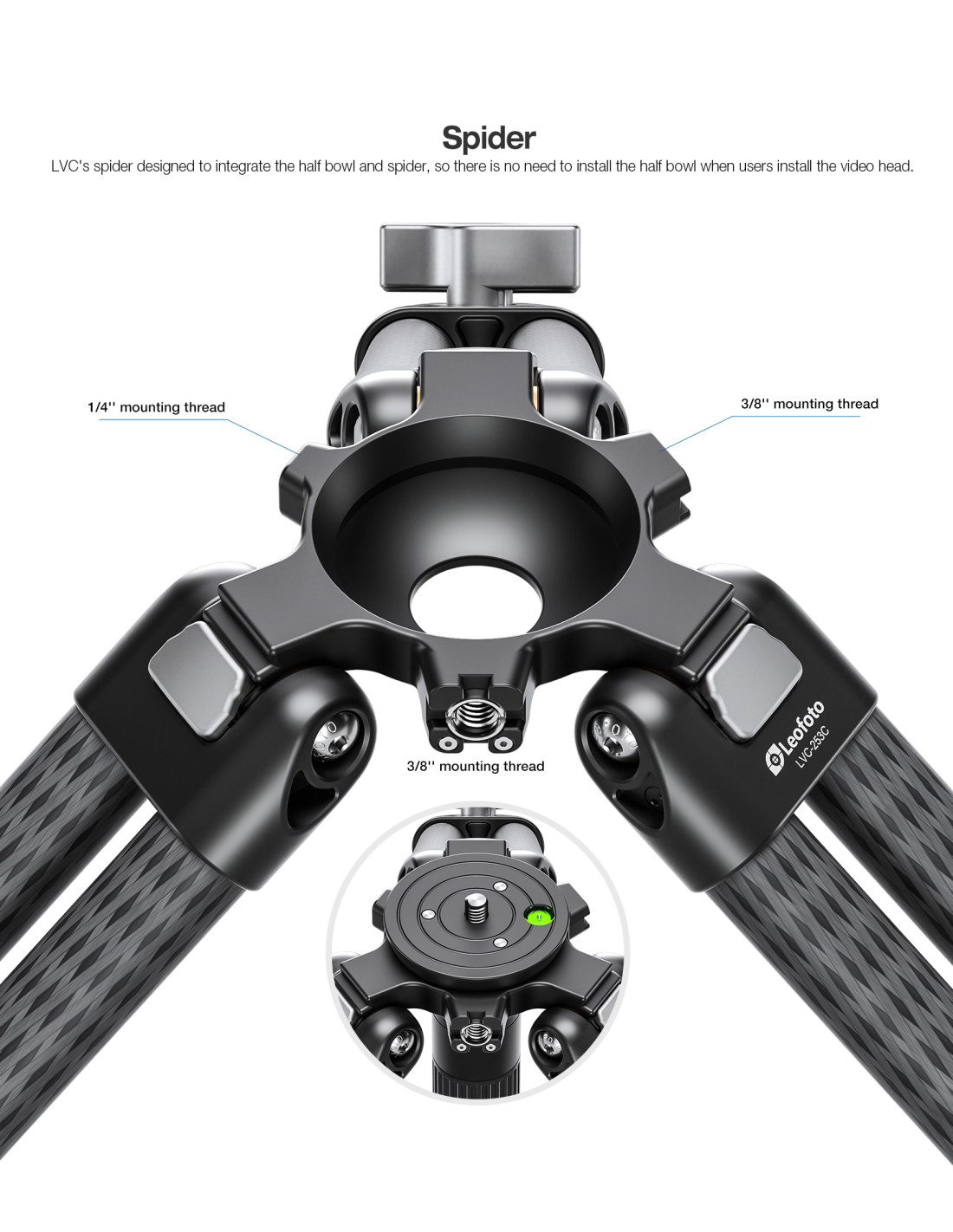 Pająk w statywach LVC został zaprojektowany tak, żeby zintegrować w sobie pół głowice i tradycyjnego pająka, nie ma więc potrzeby instalowania dodatkowej pół głowicy, gdy montujemy głowicę wideo.