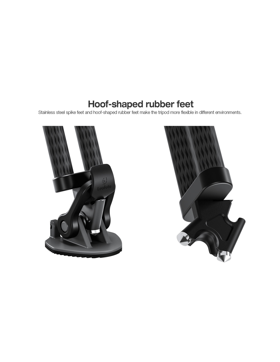Stopki z kolcami ze stali nierdzewnej i gumowe nóżki w kształcie kopyt sprawiają, że statyw jest bardziej elastyczny w różnych środowiskach.