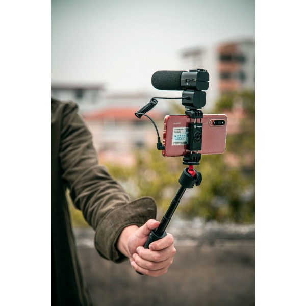 Do zestawu został dołączony uchwyt, który umożliwia zamocowanie telefonu komórkowego na statywie. Uchwyt jest kompatybilny z większością popularnych modeli smartfonów. Jego dodatkową zaletą jest gniazdo zimnej stopki, do którego możemy przykręcić mikrofon lub niewielką lampę LED. To rozwiązanie szczególnie spodoba się początkującym vlogerom.